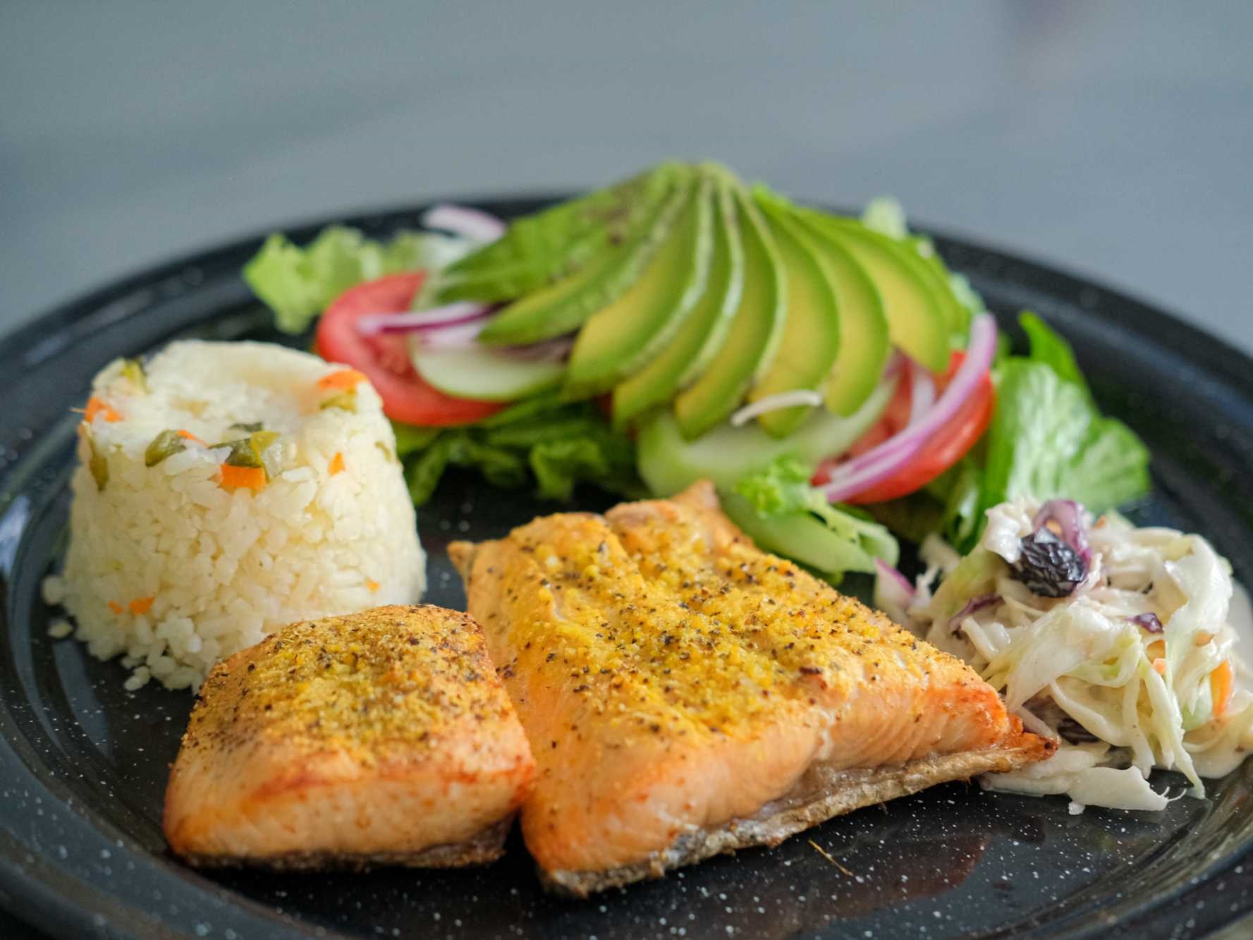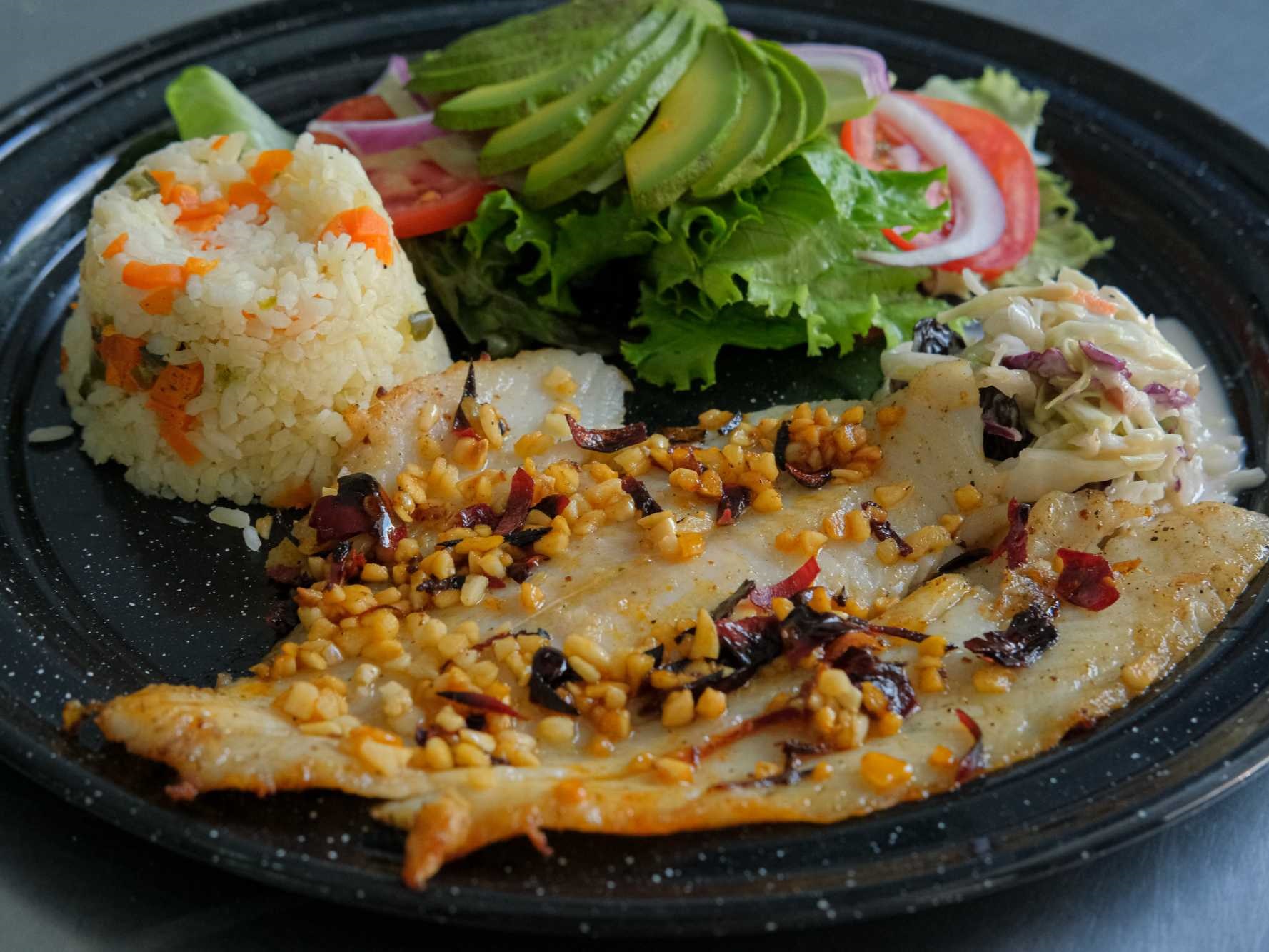 Acompañado de ensalada dulce, ensalada fresca y arroz
