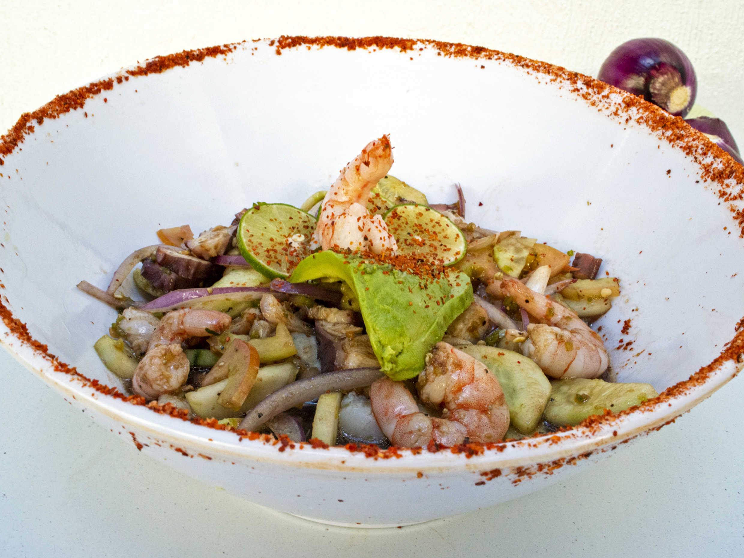 El marisco de tu elección, jitomate, cebolla, pepino, cilantro, aguacate, limón y catsup