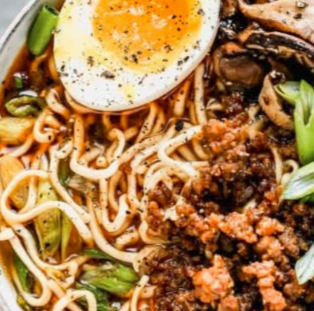 Ramen con sabor umami, un balance perfecto, sus ingredientes completos son: molida de cerdo sofrito con cebollín, naruto, lechuga chicoria, germen de soya y hongo shiitake. Este ramen cuenta con carne molida en el topping y en el caldo el cual también contiene puré de ajo, puré de jengibre, cebollín, aceite de ajonjolí, miso rojo, beef powder, salsa soya, sake y azúcar morena.