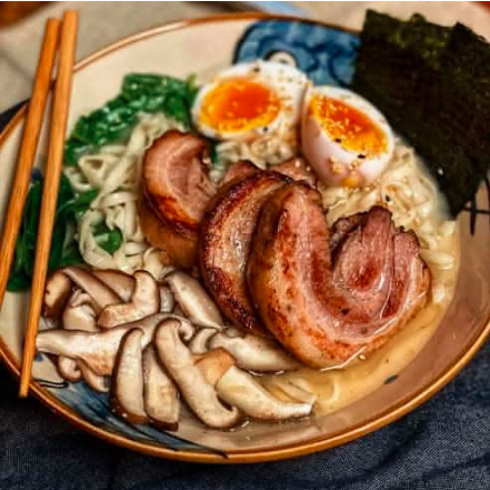 Ramen con el auténtico sabor a Japón, con ingredientes que harán que te fascine. Sus ingredientes completos son: chashu artesanal de cerdo, naruto, lechuga chicoria, cebollín, elote y hongo shiitake. Lo más delicioso de este platillo es su caldo con el mismo se coció el chashu y huesos de cerdo, tomando un sabor suave y auténtico. Al cual se le integra aceite de ajonjolí, beef powder, azúcar moren