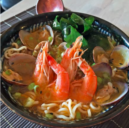 Ramen con deliciosos mariscos para los amantes del mar, sus ingredientes completos son: camarón, tentáculos, almeja chirla, seafood powder, lechuga chicoria,elote, poro, naruto.