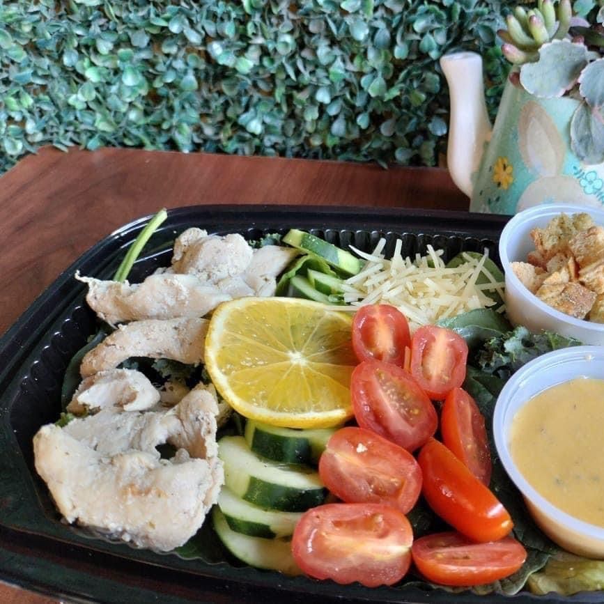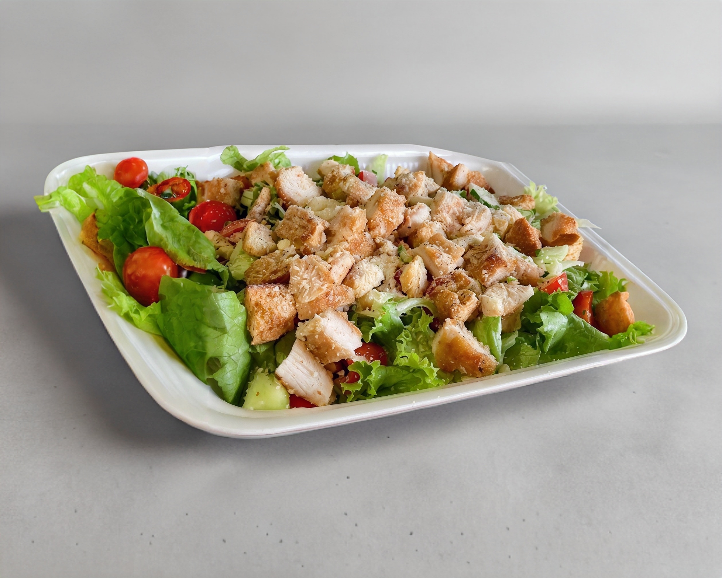 Lechuga, jitomate, zanahoria, crotones, pollo a la plancha y aderezo.