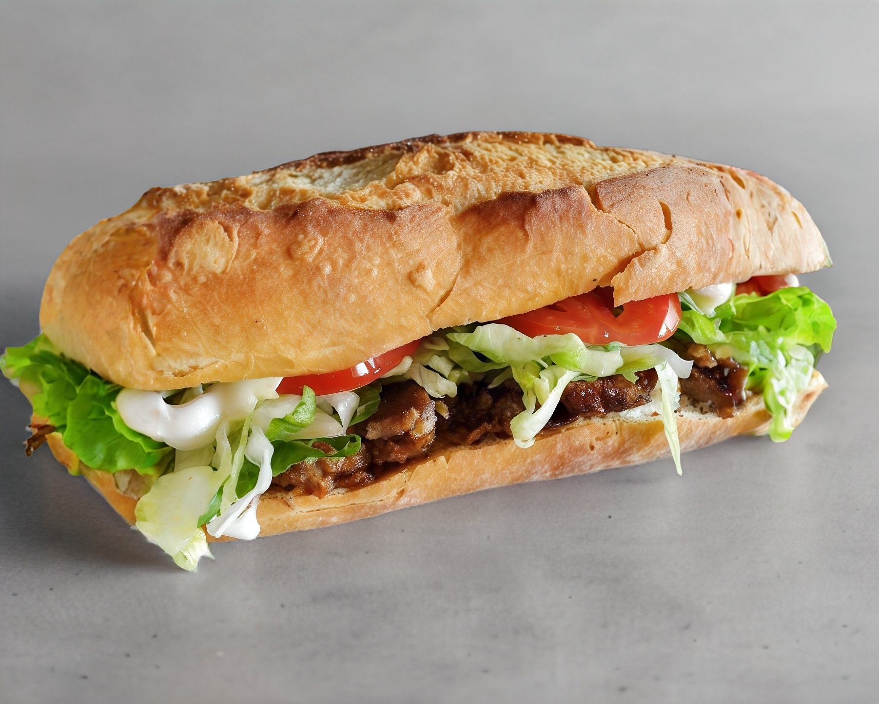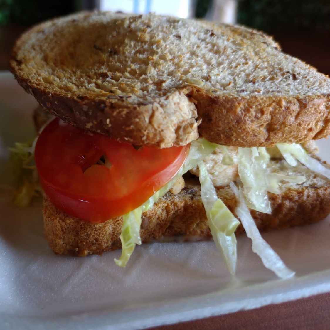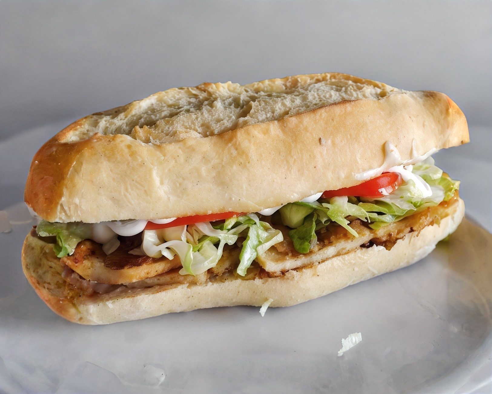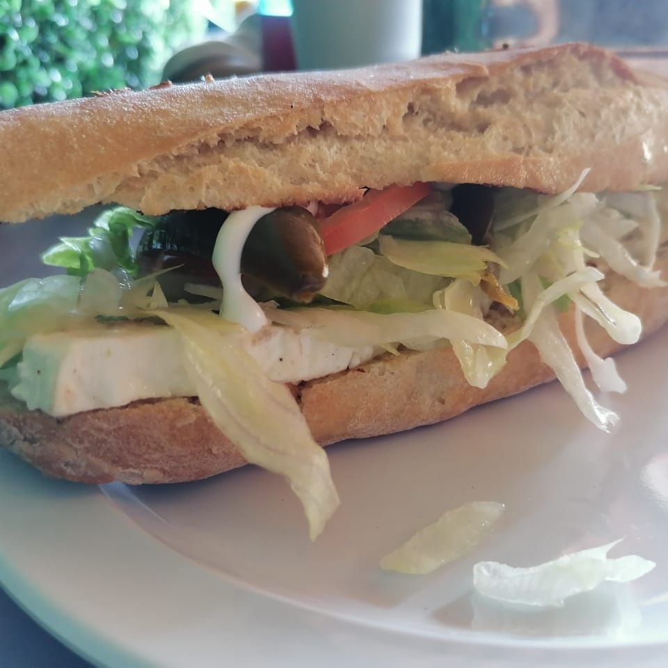 Sándwich doradito con pollo a la plancha y verdura fresca.