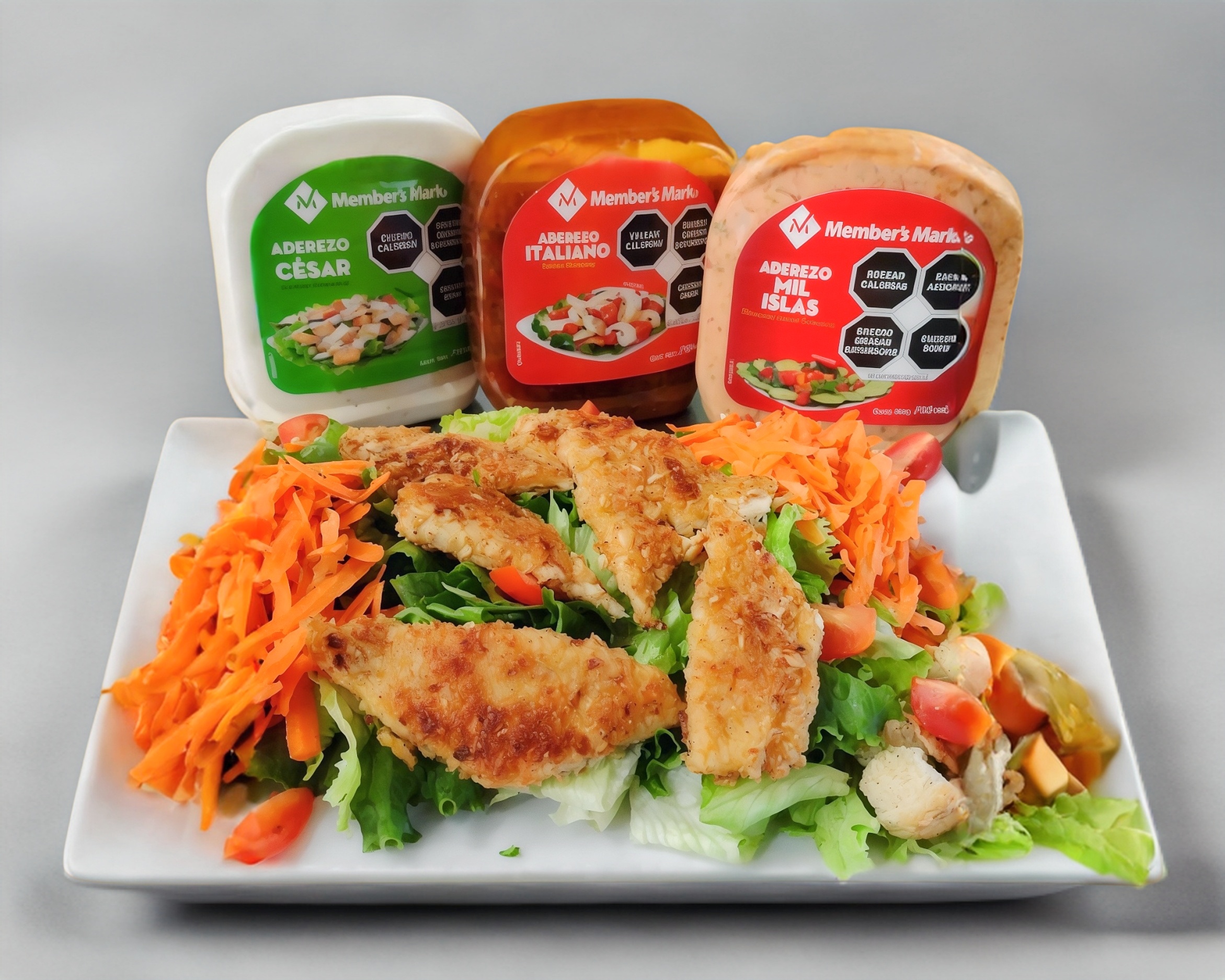Lechuga, zanahoria, jitomate, fajitas de pollo empanizadas, crotones y aderezo.