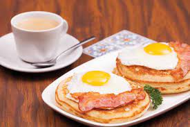 2 piezas de hotcakes con maple, huevo estrellado con tocino y 1 café de olla.
