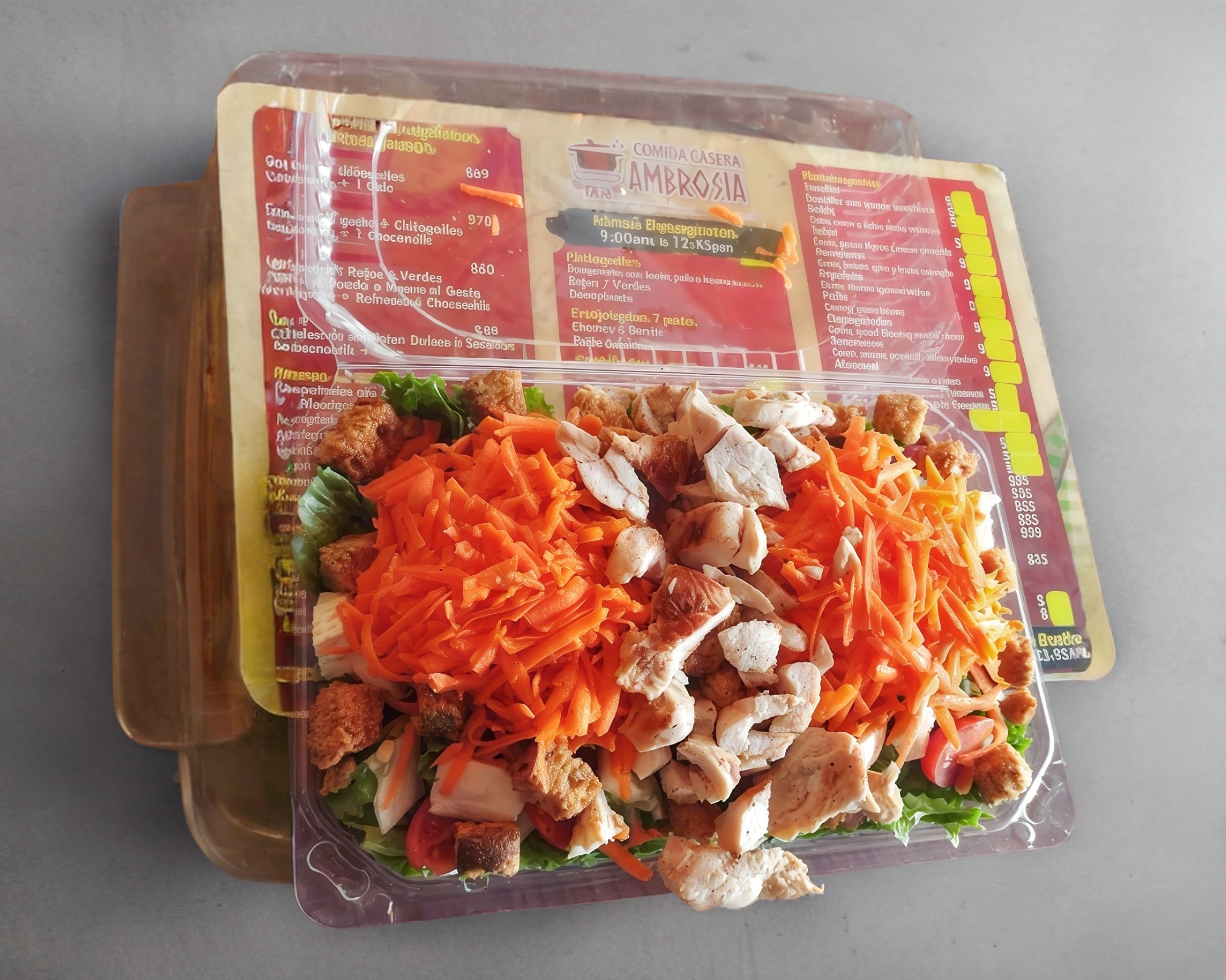 Lechuga, jitomate, pollo, panela, morrón, crotones, pepino, zanahoria.