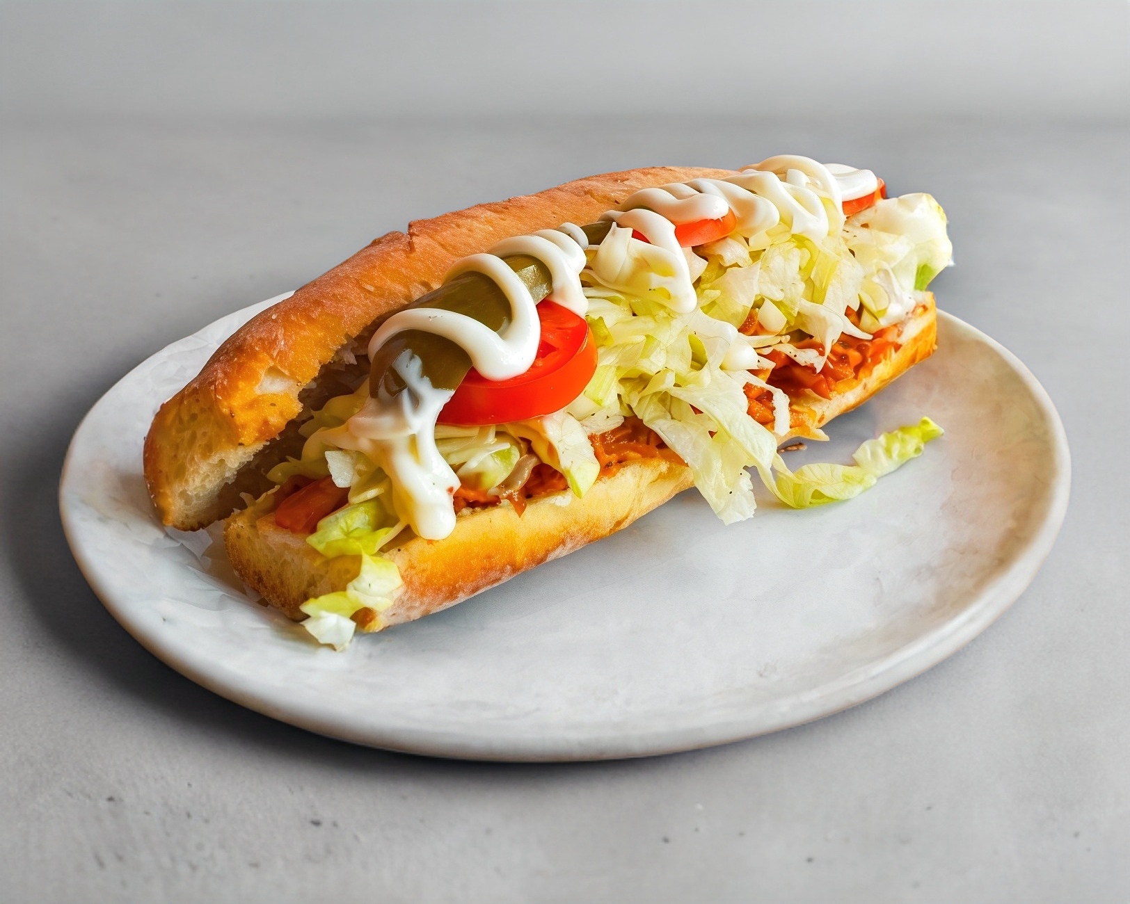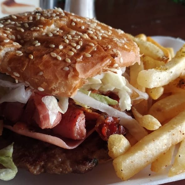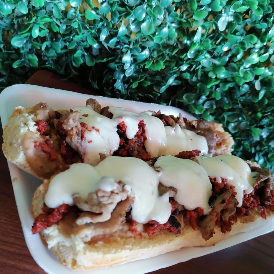 Pan, carne de res 100% casera, crema, mayonesa, mostaza, chile, jalapeño.