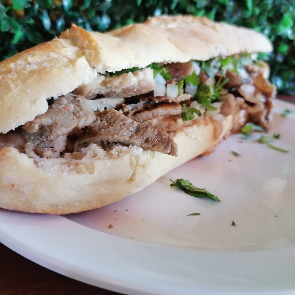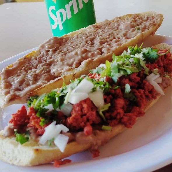 Mayonesa, crema, asada, cebolla, cilantro y birote dorado.
