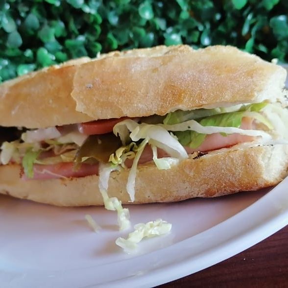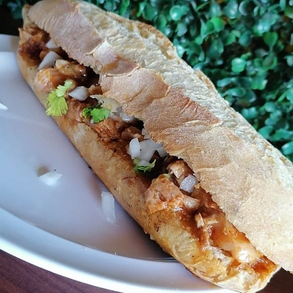 Pierna adobada con lechuga, jitomate, chile jalapeño y bolillo dorado.