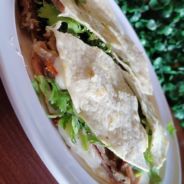 Tortilla de harina, con asada, chorizo y queso gratinado.