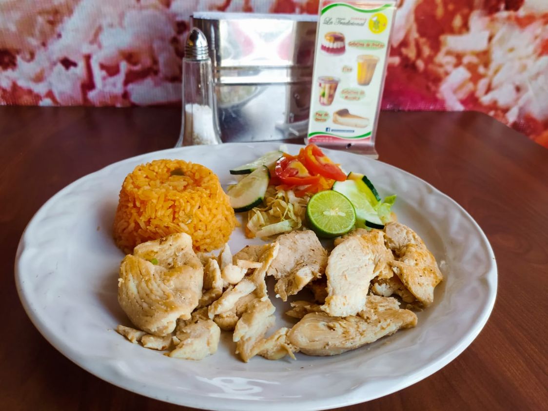 Rica pechuga en fajitas sazonada y sin grasa además de guarniciones, entrada y agua fresca.