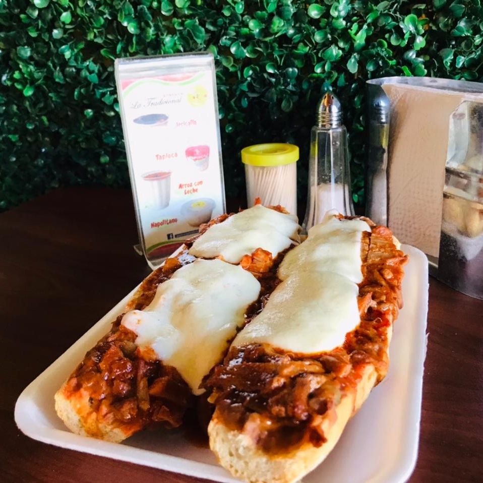 Birote dorado con frijoles, barbacoa, queso gratinado.