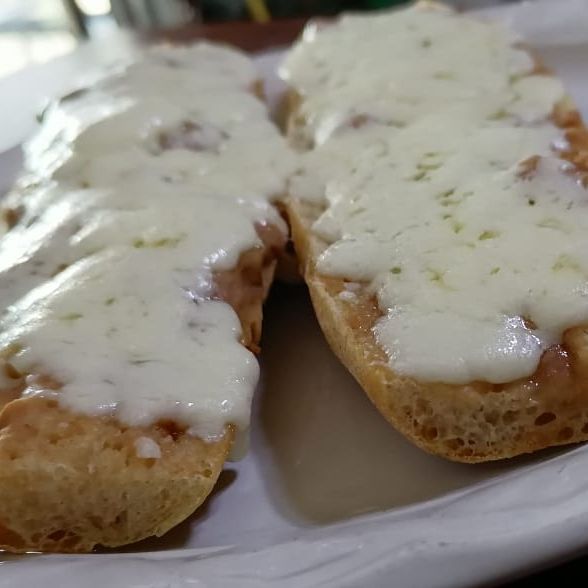 Molletes dorados 1/2 frijol con queso gratinado y la otra mitad dulce.
