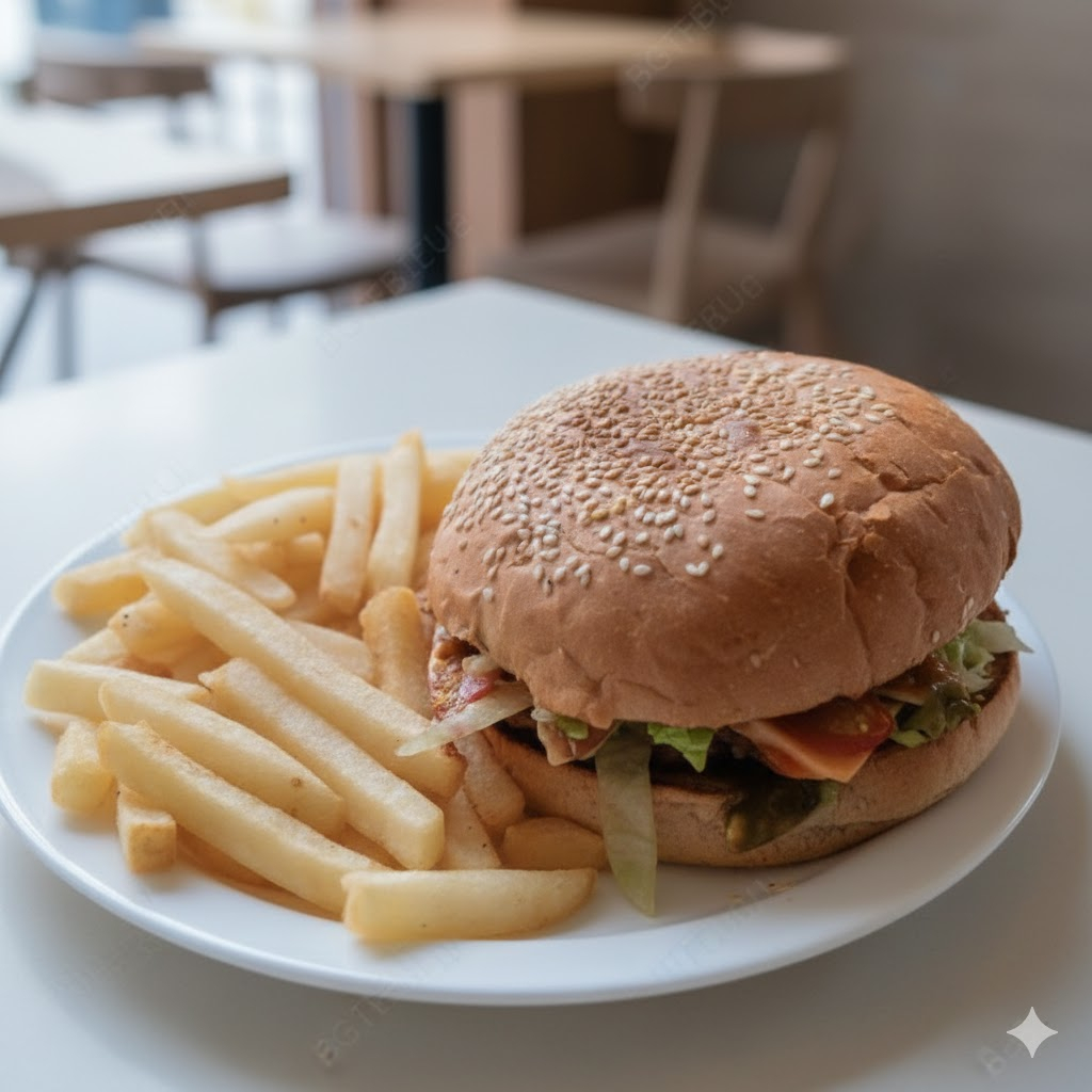 Hamburguesa Grande con guarnición de papas a la francesa.