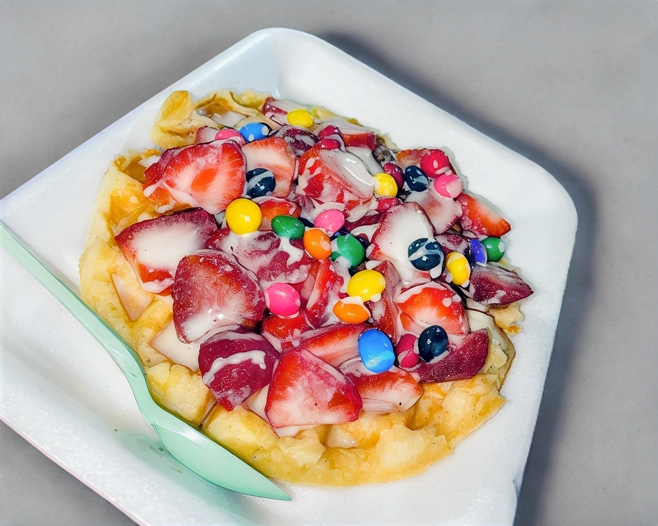 delicioso waffle dulce con fruta de fresa y topping de luneta