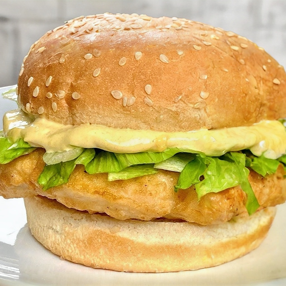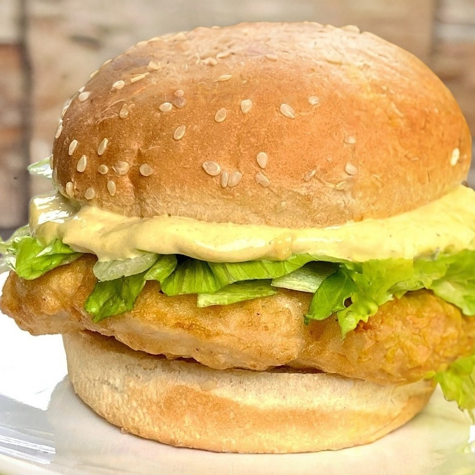 Rica Hamburguesa de Pechuga de Pollo Empanizada, acompañada de lechuga, jitomate, cebolla y aguacate.