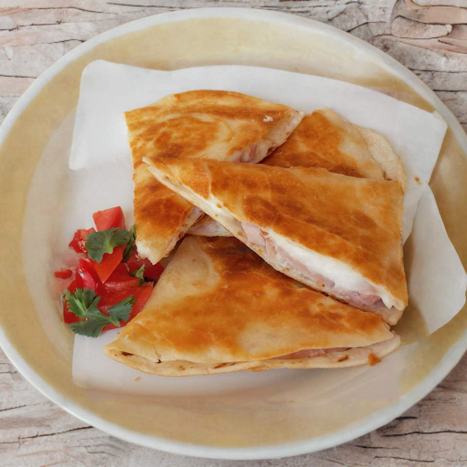Base de Tortilla de Harina, Queso fundido y porcion de ensalada