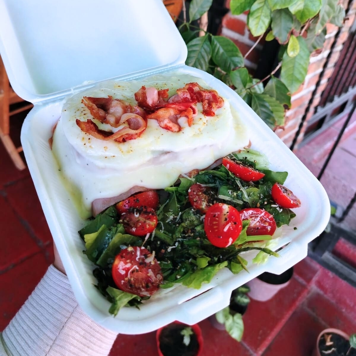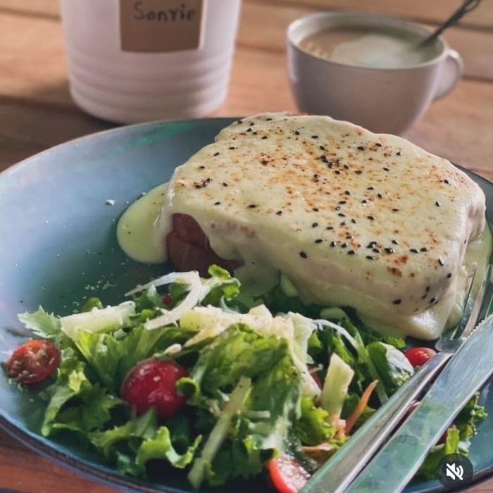 Sándwich de jamón de pierna y tocino bañado en salsa de parmesano cremosa acompañado de ensalada de la casa.