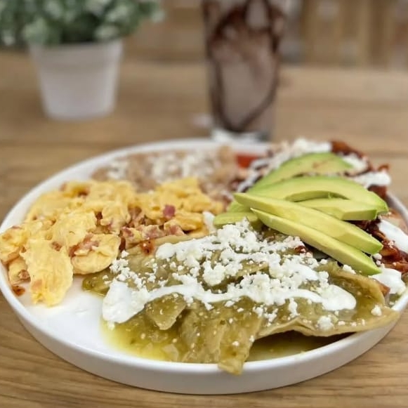 Clásicos chilaquiles Rojos con queso, crema, huevo y frijoles.