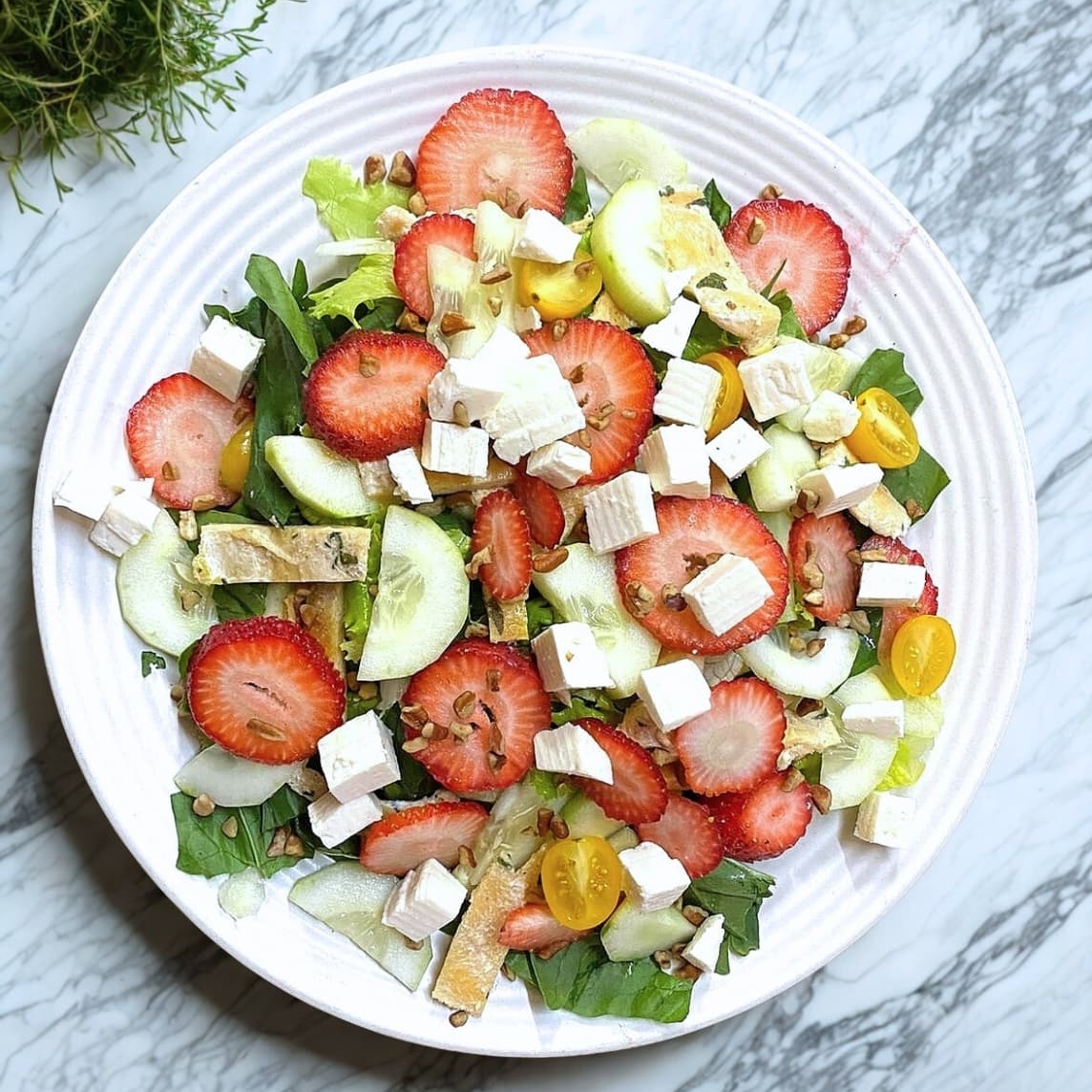 Lechuga, espinaca, pollo a la plancha, Fresa, nuez, panela, pepino y vinagreta de frutos rojos.