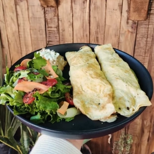 Omelettes 2 pzas, jamón de pierna y queso, acompañados de ensalada y frijoles.
