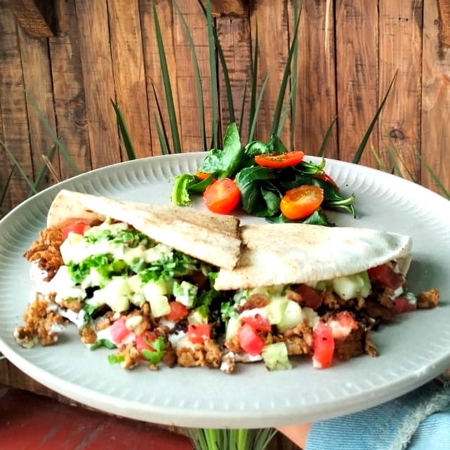 Pan pita con base de jocoque, relleno de carne, pepino, jitomate, y perejil.