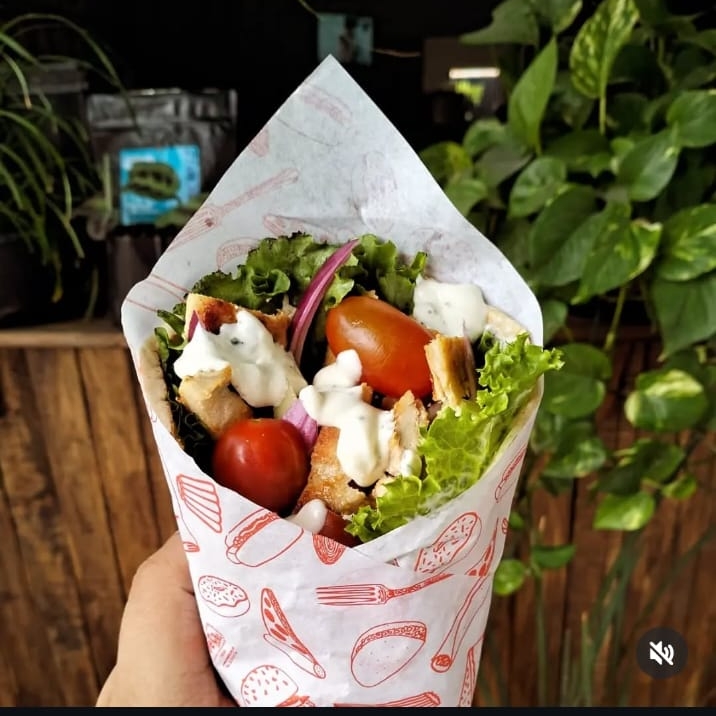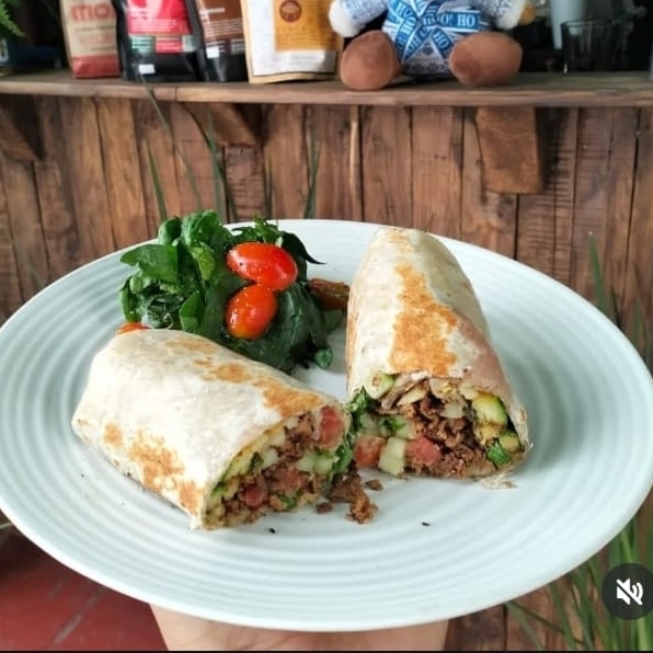 Rollo tipo burrito de tortilla de 35 cm relleno de carne de res, papas, calabaza, pepino, jitomate y perejil.