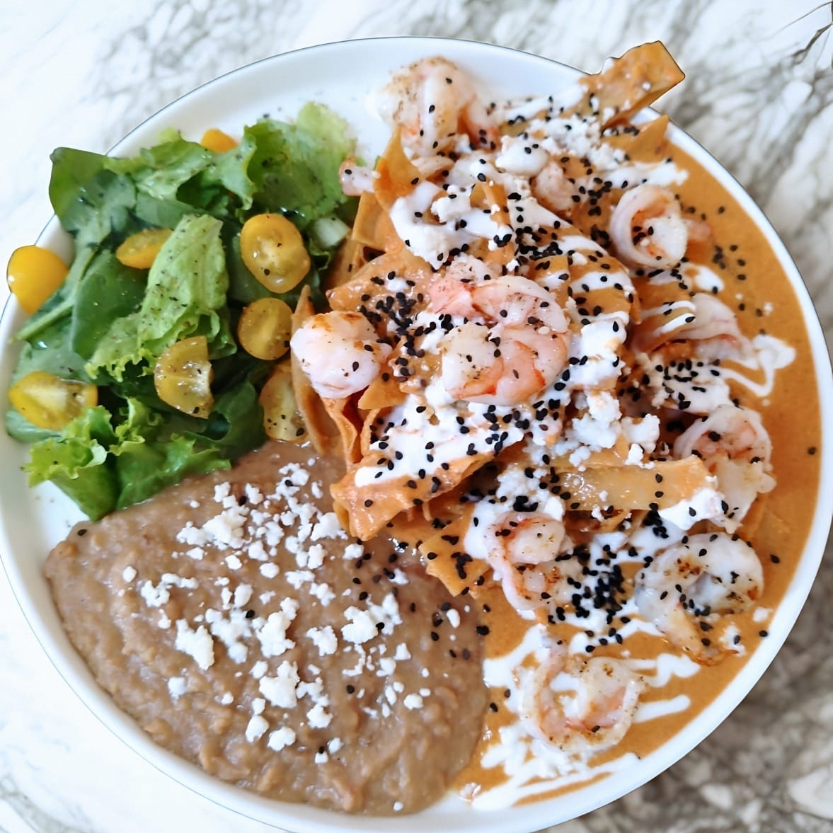 Chilaquiles con salsa cremosa de chipotle coronados con camarones a la mantequilla y acompañados de frijoles refritos caseros.