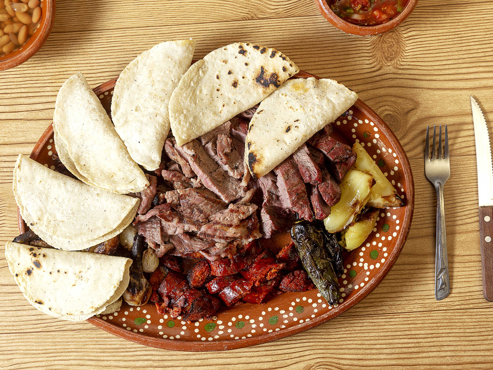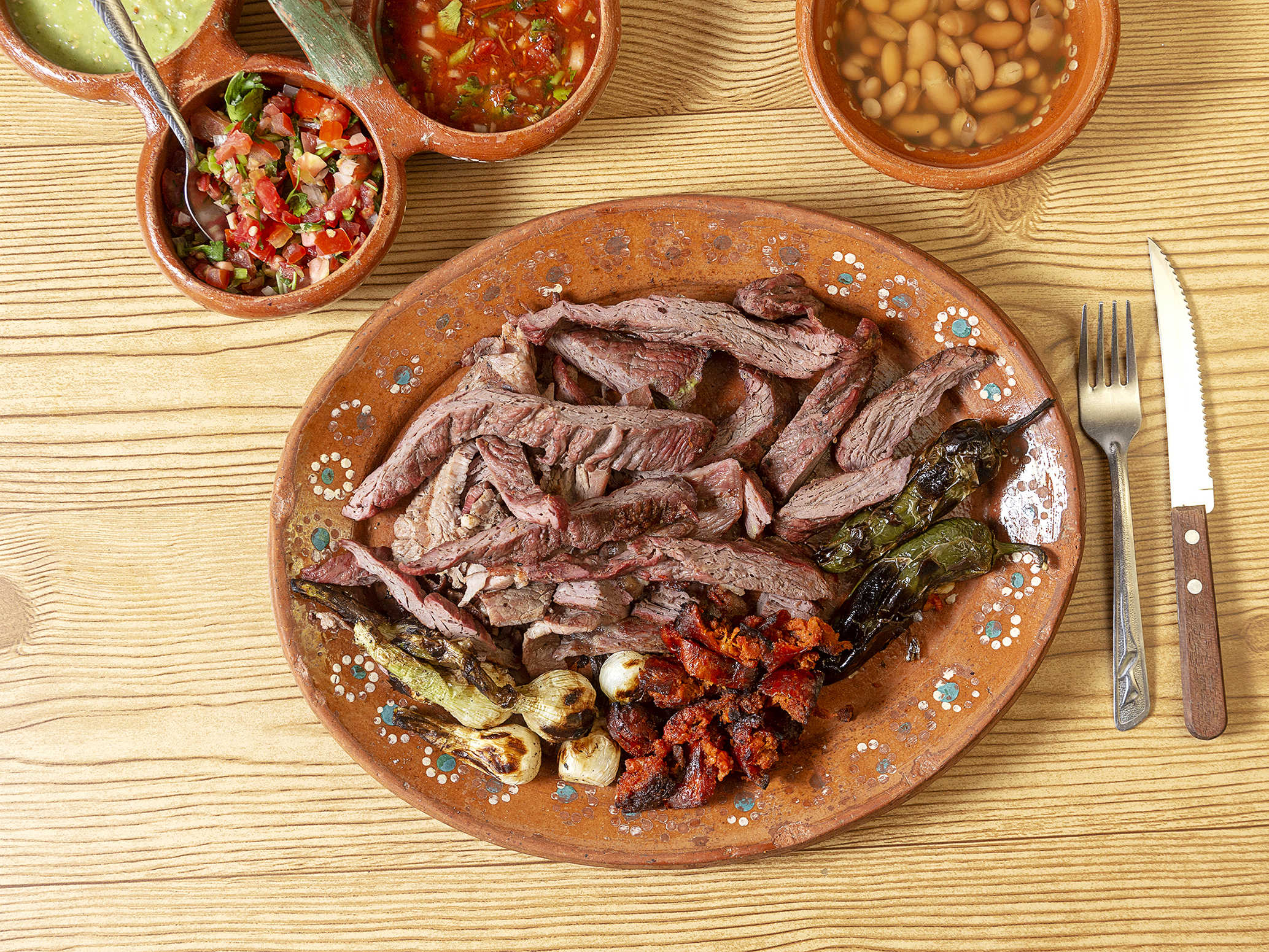 frijole, salsas, tortillas, chorizo, cebollitas y chiles toreados.