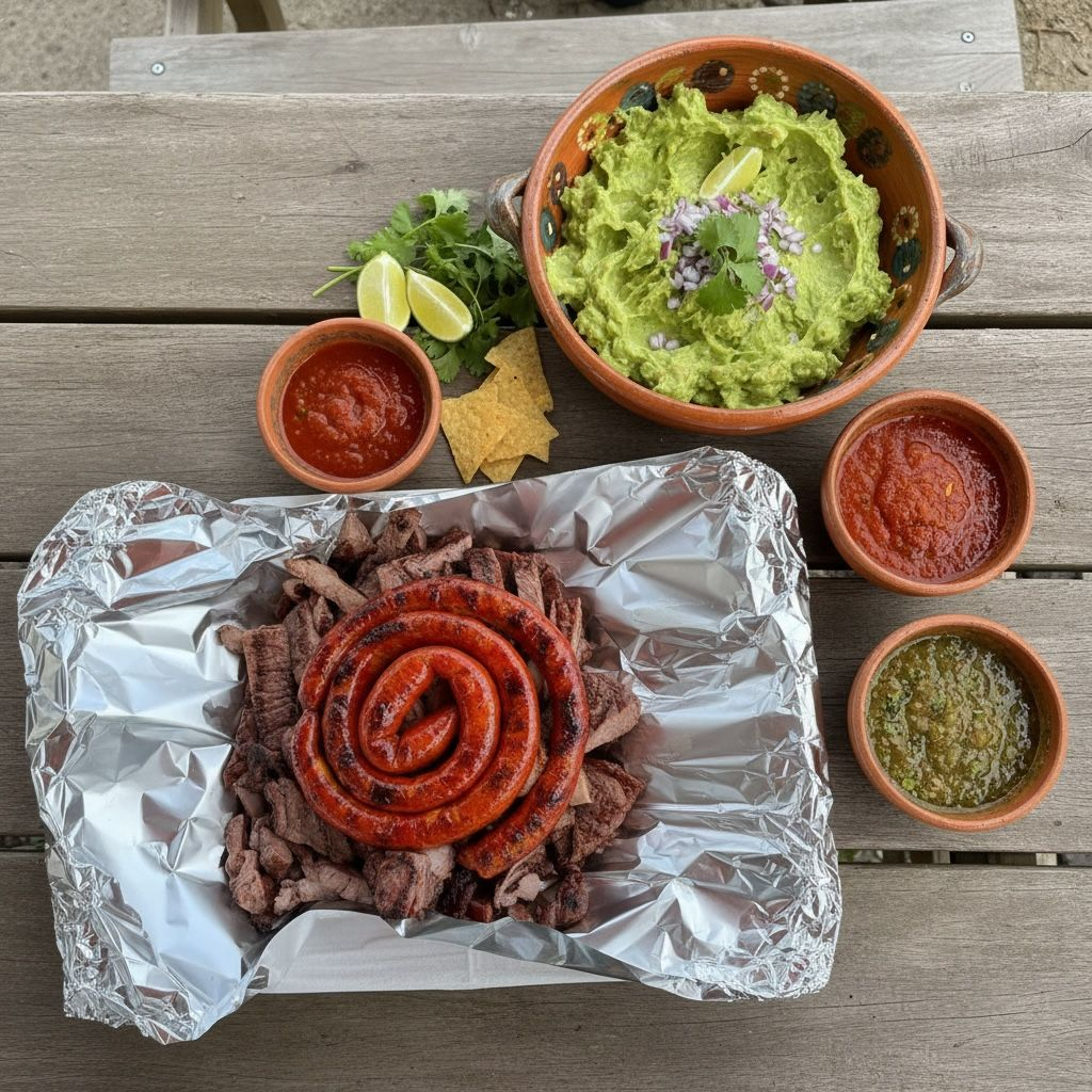 Arrachera 1 kg y chistorra 250 g (peso en crudo), acompañadas de guacamole fresco y tortillas. exterior dorado, carne jugosa y sabores auténticos para una comida familiar o reunión. rinde 3 a 4 porciones.