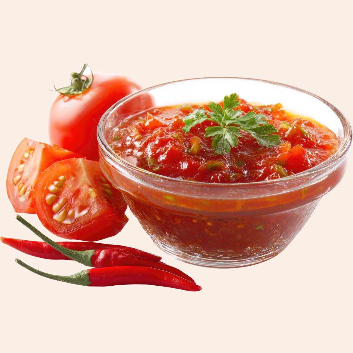 Salsa martajada hecha con rico jitomate asado, chile verde asado, cebolla y ajo. picor medio