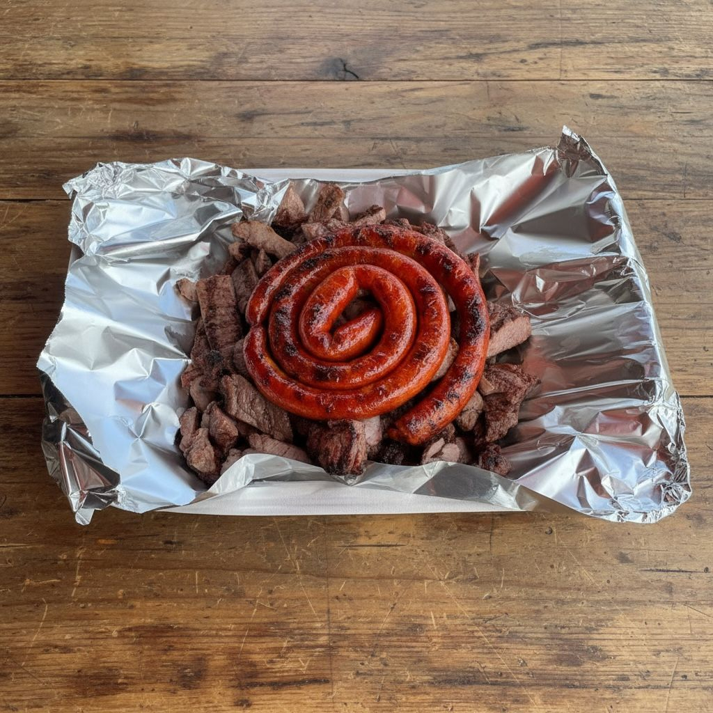 Arrachera 1 kg, chorizo 1/2 kg, chistorra 250 g (peso en crudo) , exterior dorado, carne jugosa acompañado de tortillas, sabores auténticos para una comida familiar o reunión. rinde 3 a 5 porciones. (Peso en crudo)