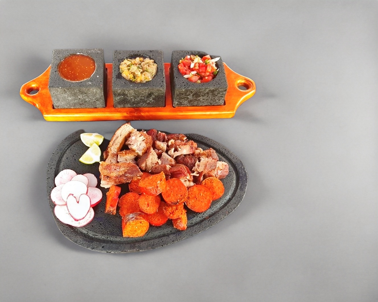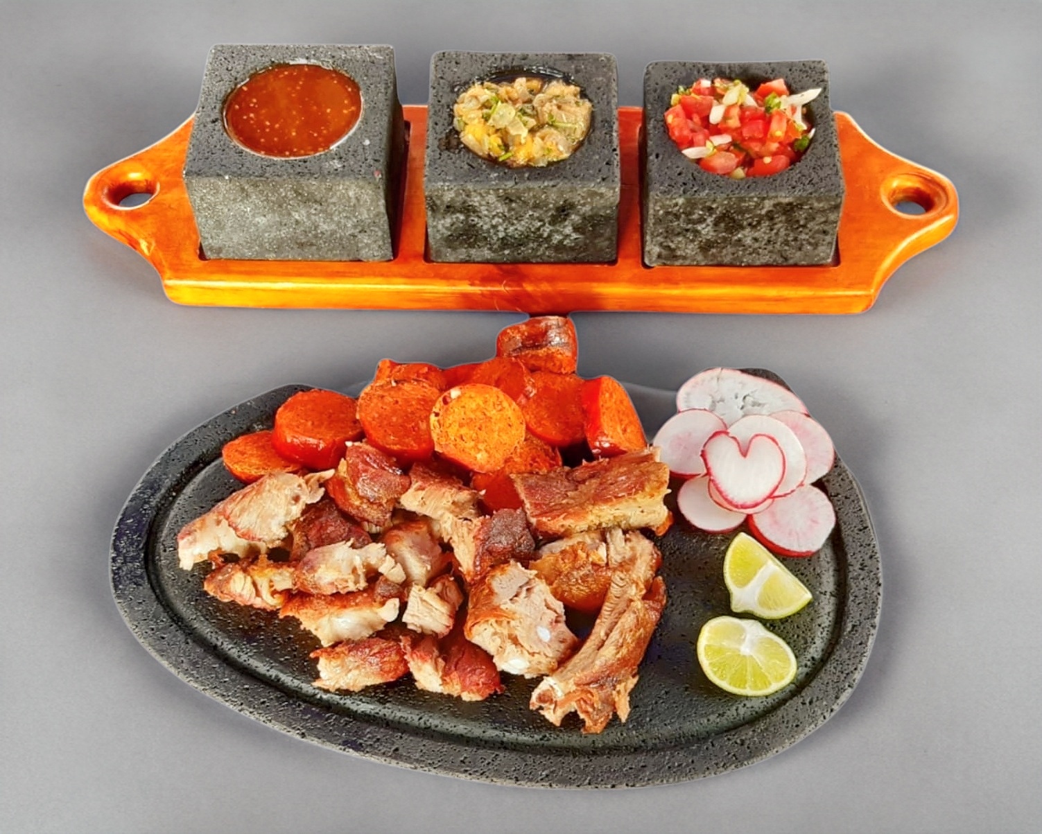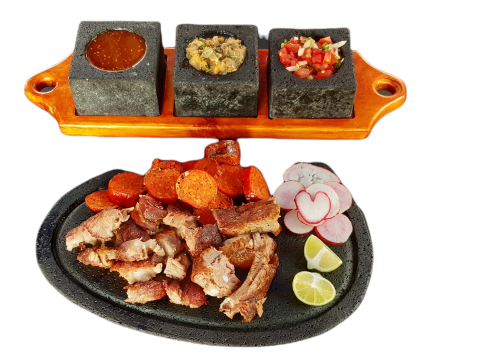 (200 g) Carne asada a fuego lento con leña de encino. Incluye Lechón, Costilla y 1 chorizo. Acompañamiento: salsa picante, no picante, pico de gallo y 5 tortillas de maíz grande. (Porción personal)