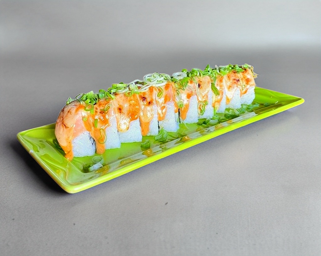 Rollo horneado, envuelto en salmón, coronado con aderezo chipotle, manchego, vegetariano al centro.