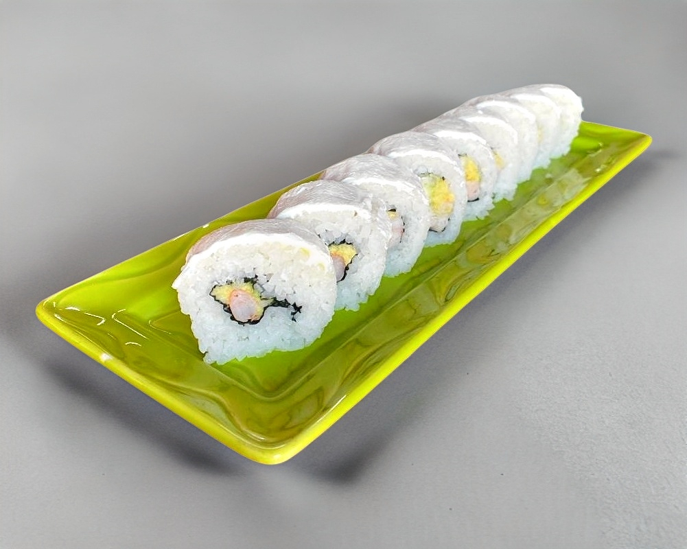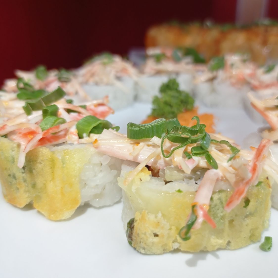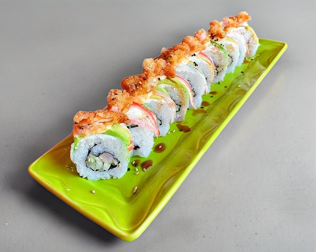 Envuelto en kanikama, aguacate, coronado con aderezo especial, camarón emapanizado, relleno de Anguila y pepino.