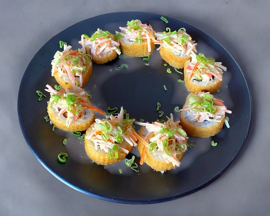 Envuelto en queso manchego y chile serrano, al centro kanikama emapanizado, aguacate, pepino.