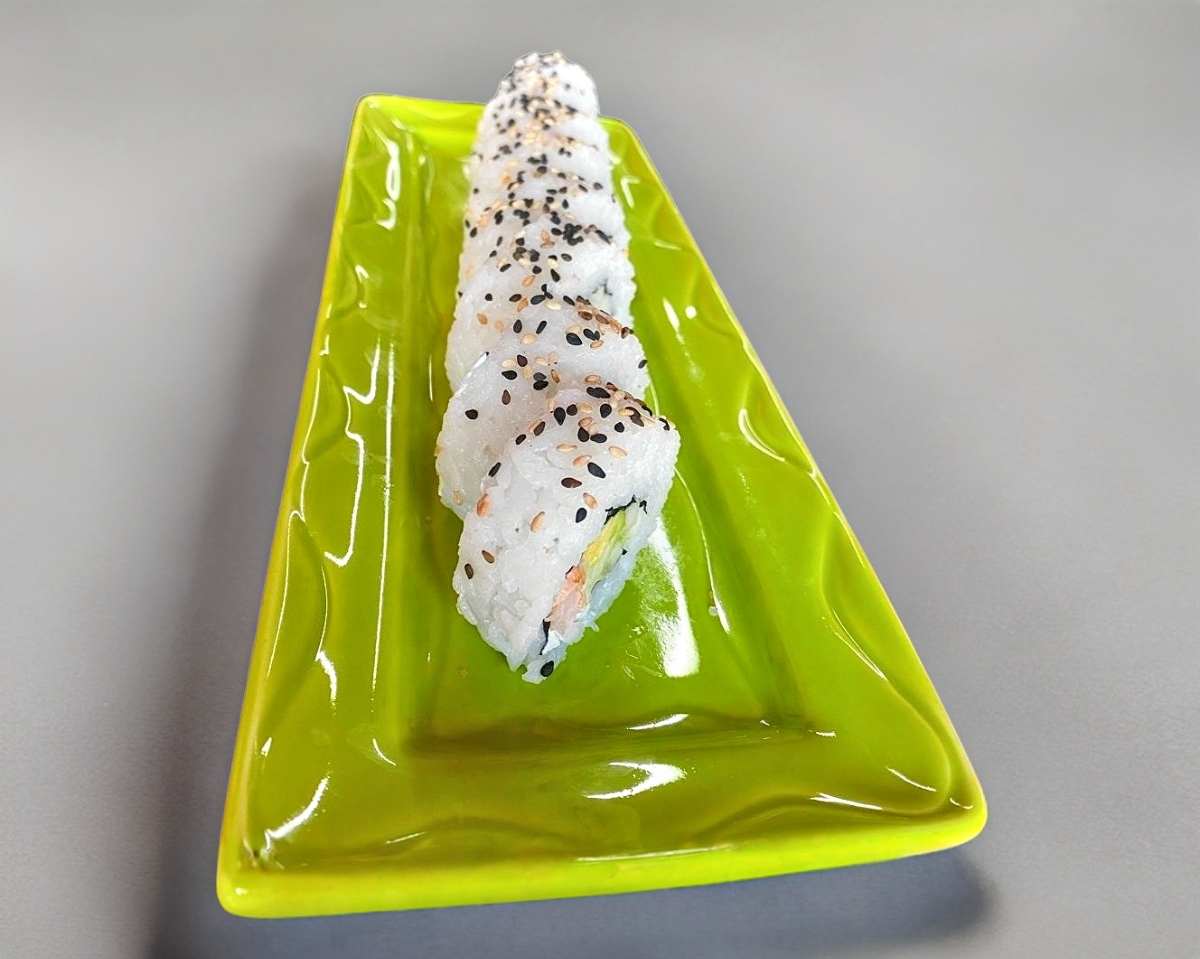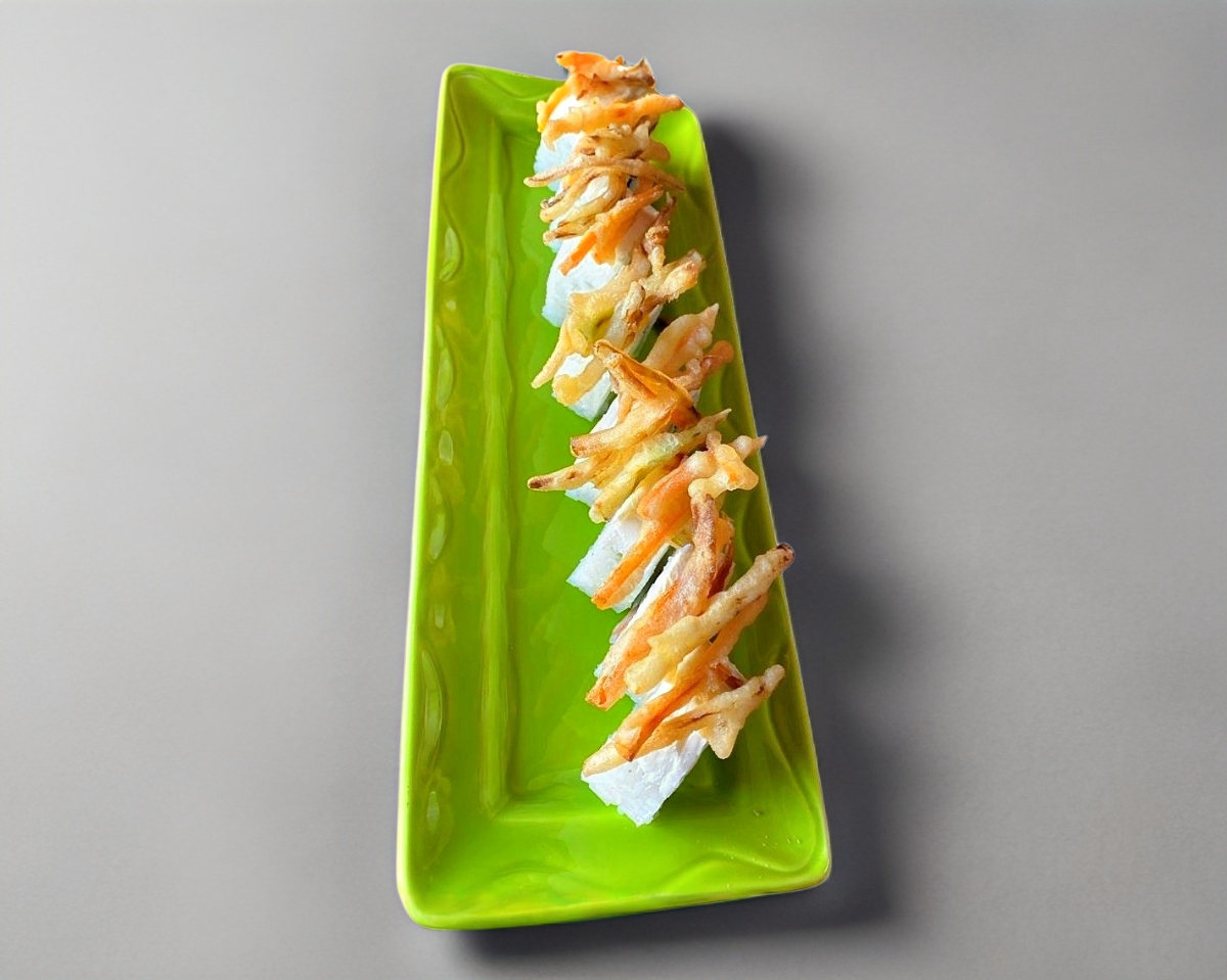 Verduras tempura por fuera, envuelto en philadephia, al centro, aguacate, pepino, proteína a eligir