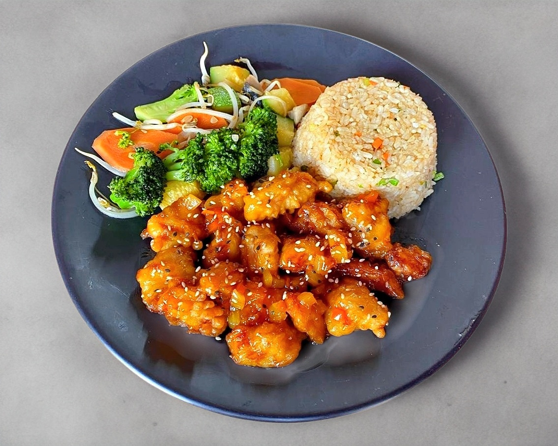 Pollo capeado, bañado en salsa agridulce, acompañado con arroz frito y verduras a la plancha.
