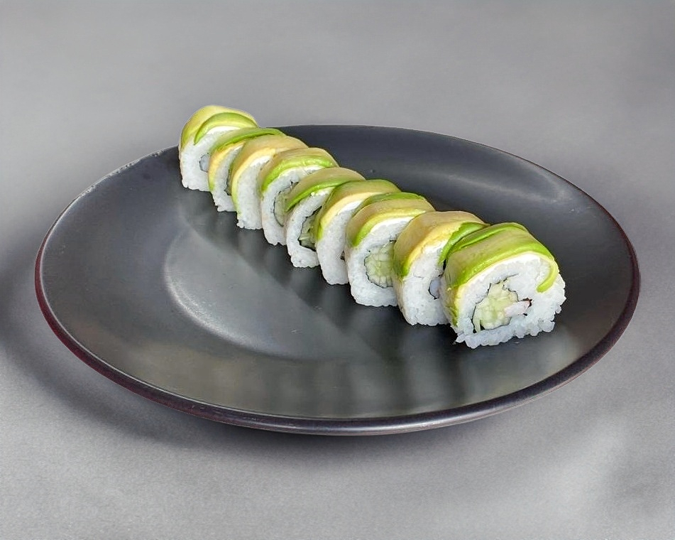 Rollo envuelto en aguacate, al centro pepino, philadephia, proteína a eligir