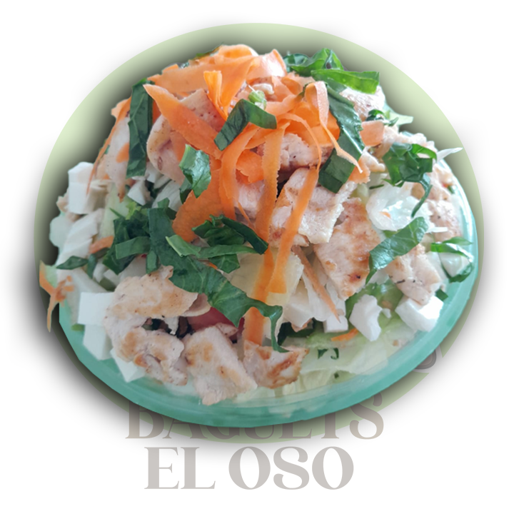 Panela, pechuga de pollo, lechuga fresca, espinacas, zanahorias, pepino, jitomates, crutones y semillas