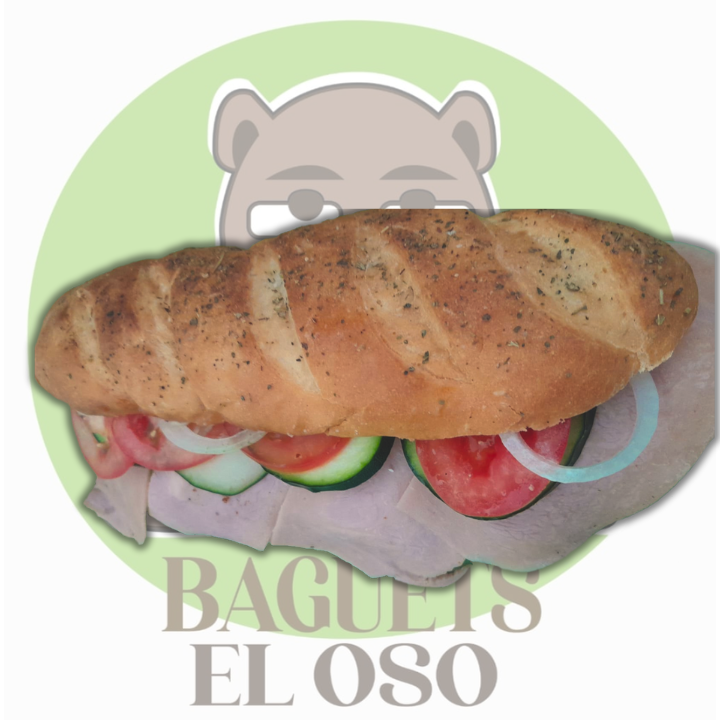 ¡Baguette con Jamón de Pavo! Pan recién horneado, tierno jamón de pavo, queso cremoso, lechuga fresca, tomate jugoso y pepino crujiente. ¡Saludable y delicioso! 🥖✨ Pídelo ahora.
