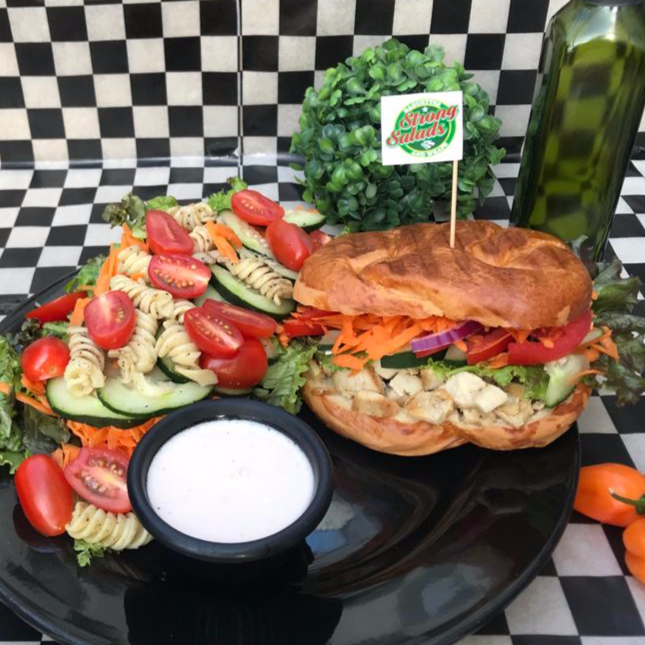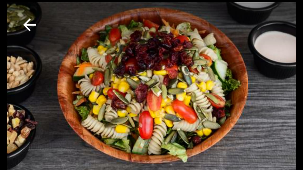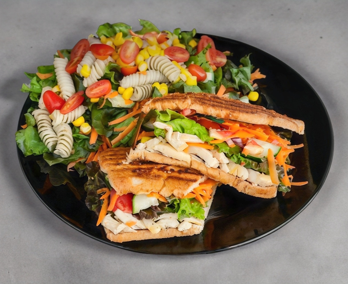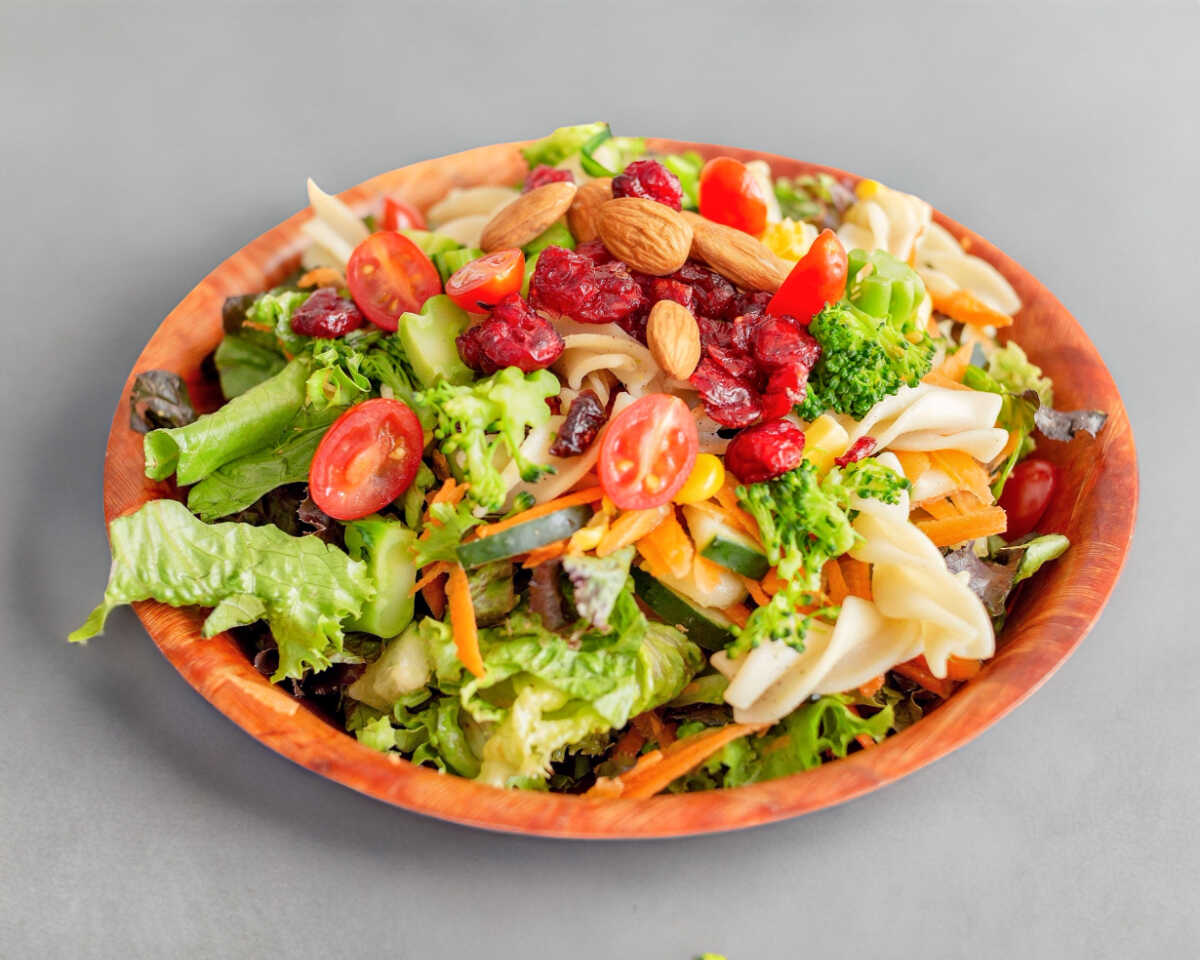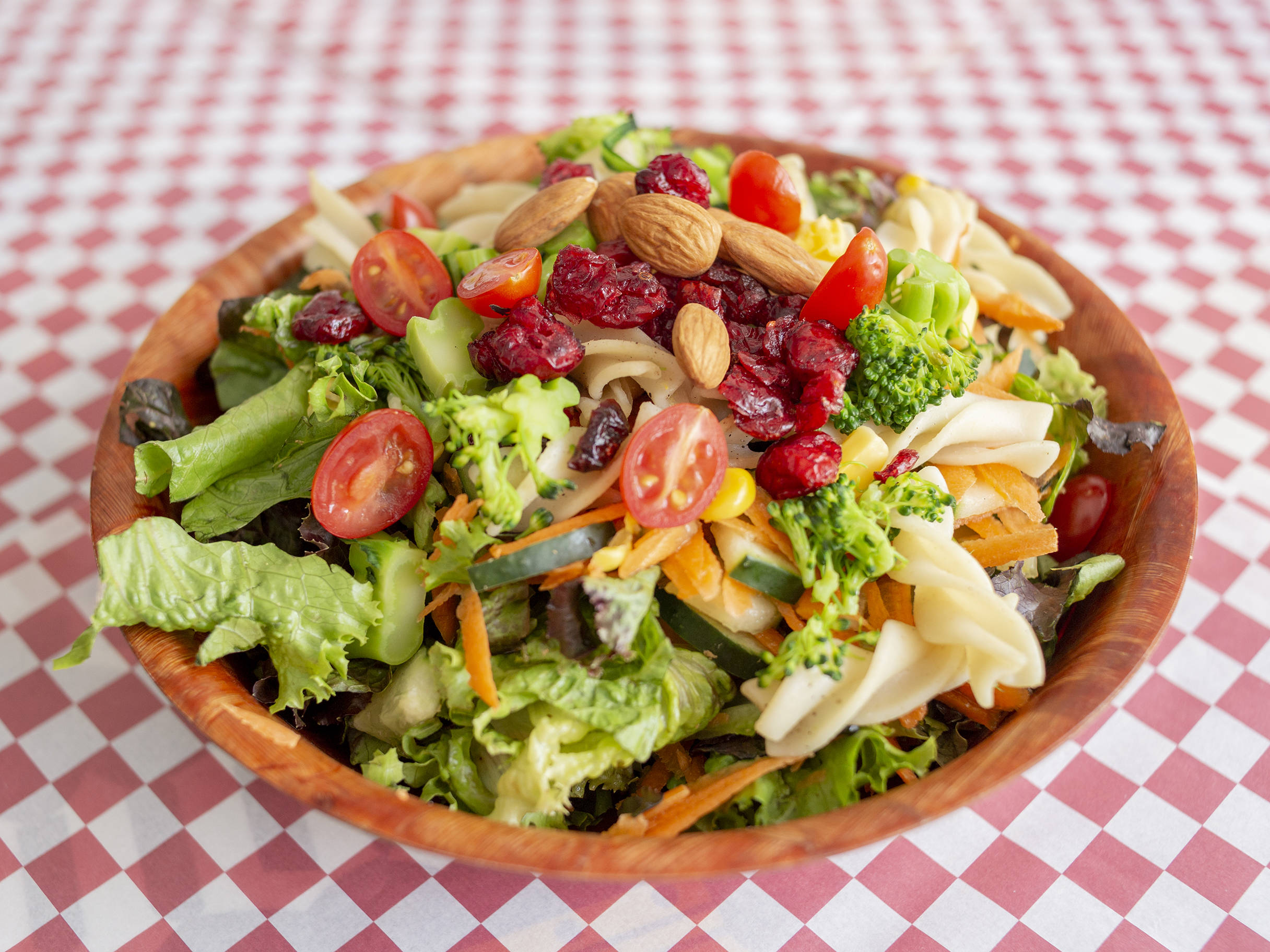 Ensalada con lechuga, pasta, pollo, aderezo gourmet y 2 ingredientes a elegir.