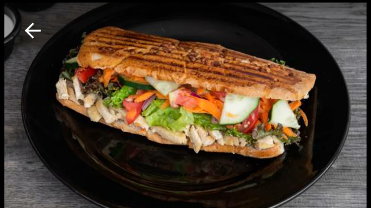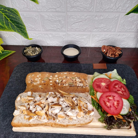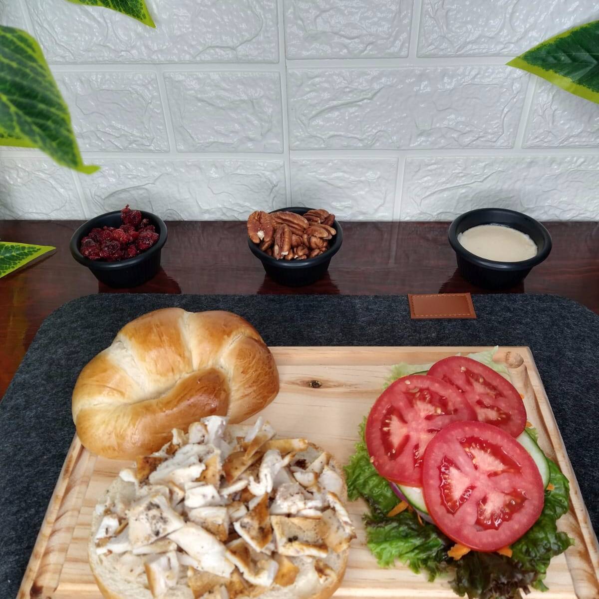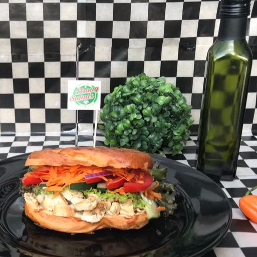 Baguette con pollo con salsa mango habanero, cama de lechuga, cebolla morada, pepino, jitomate y zanahoria rallada.