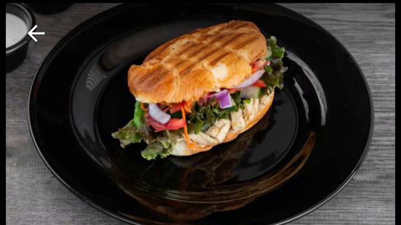 Croissant con pollo con salsa mango habanero, cama de lechuga, cebolla morada, pepino, jitomate y zanahoria rallada.