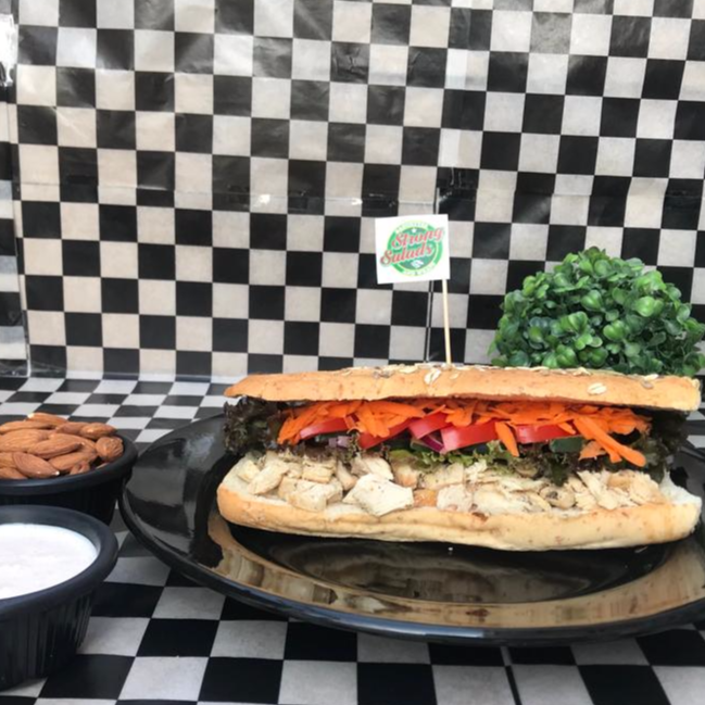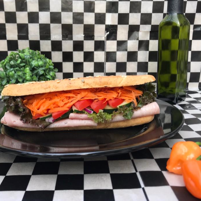 Baguette con pollo con salsa agridulce, cama de lechuga, cebolla morada, pepino, jitomate y zanahoria rallada.
