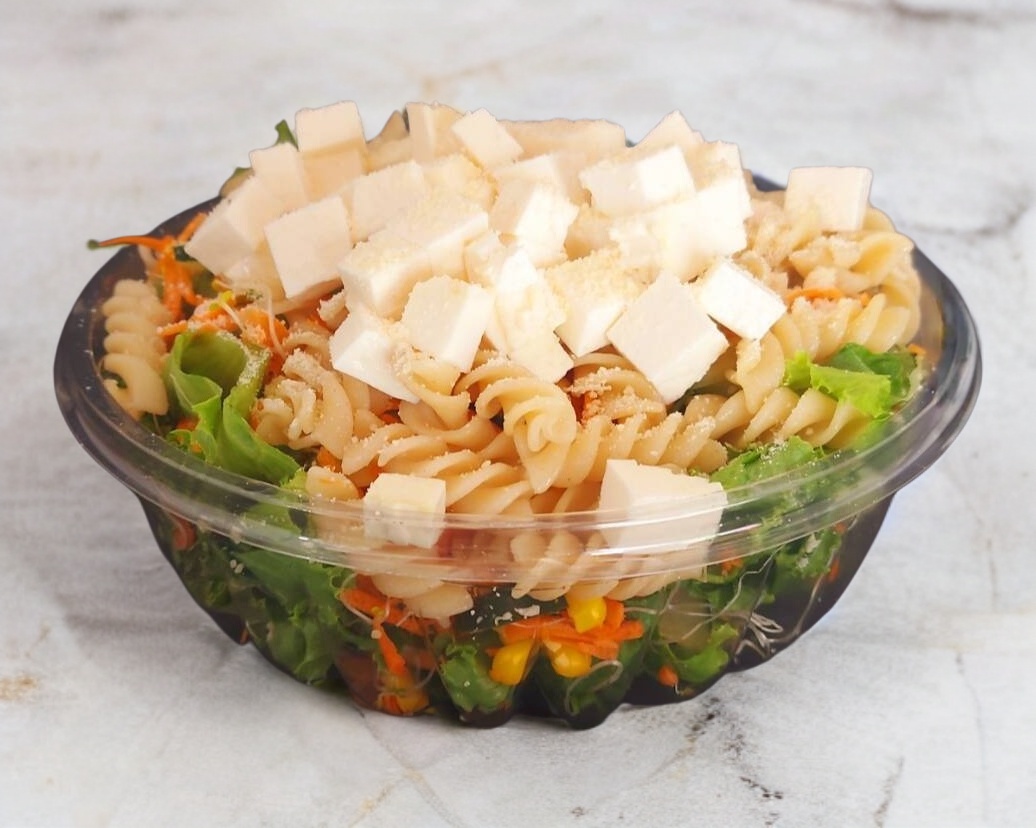 Base de lechuga, pollo empanizado, pepino, zanahoria, jitomate cherry, elote amarillo.