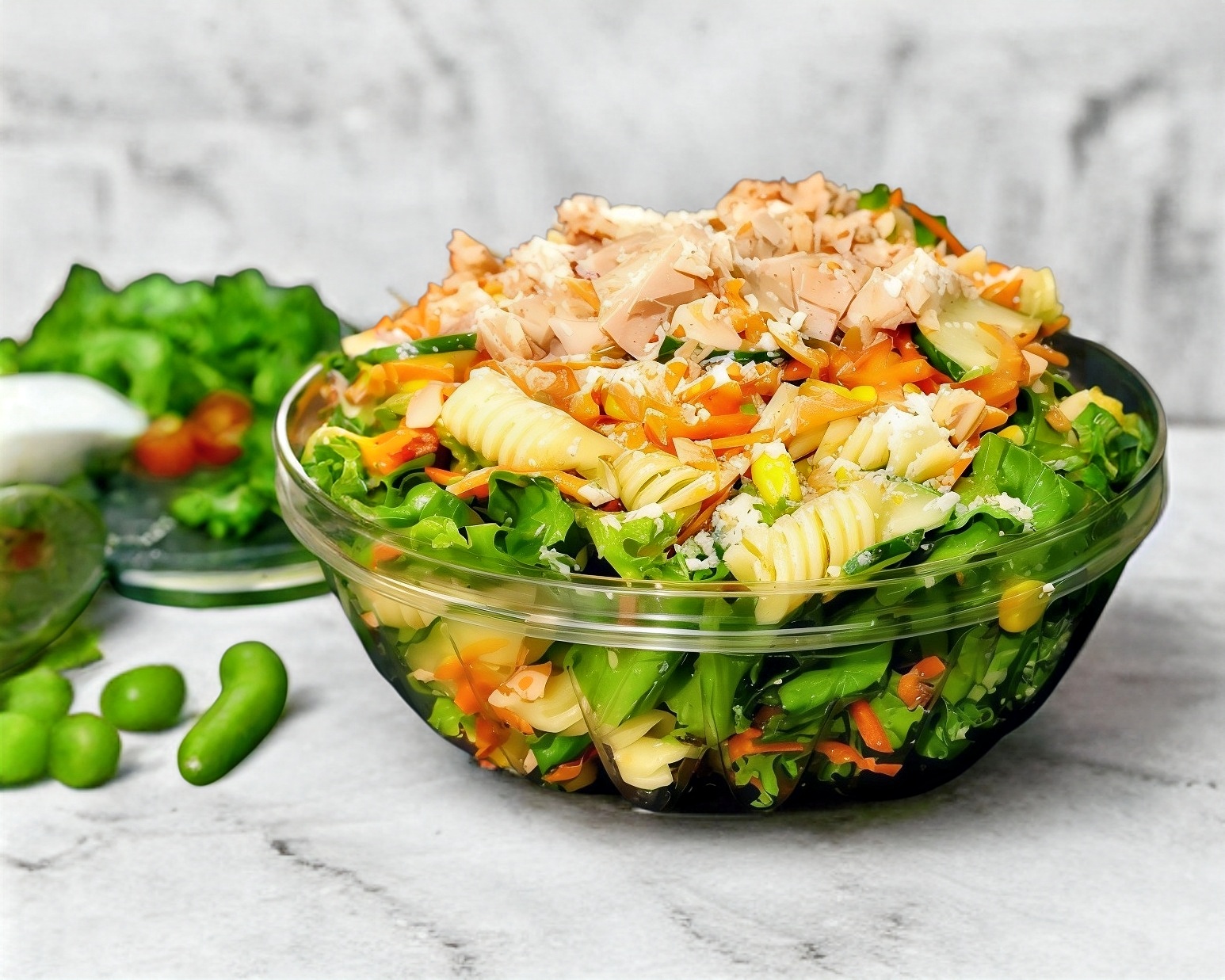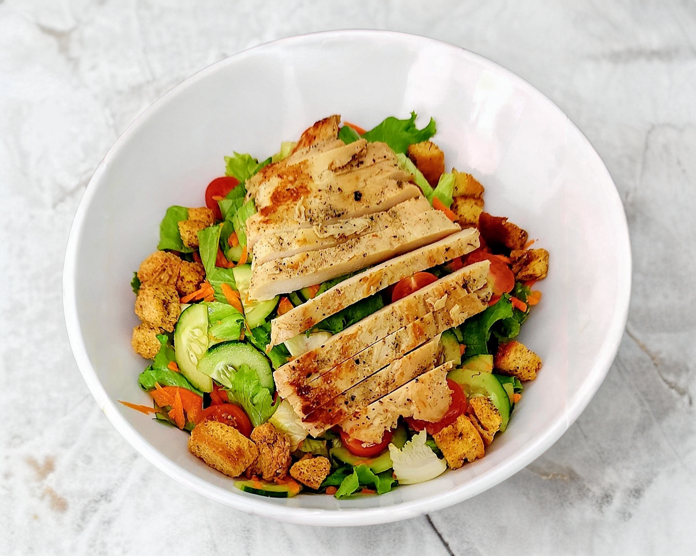 Pollo a la plancha (150gr), base de lechuga italiana, pepino, zanahoria, elote, jitomate cherry, germinado de alfalfa.