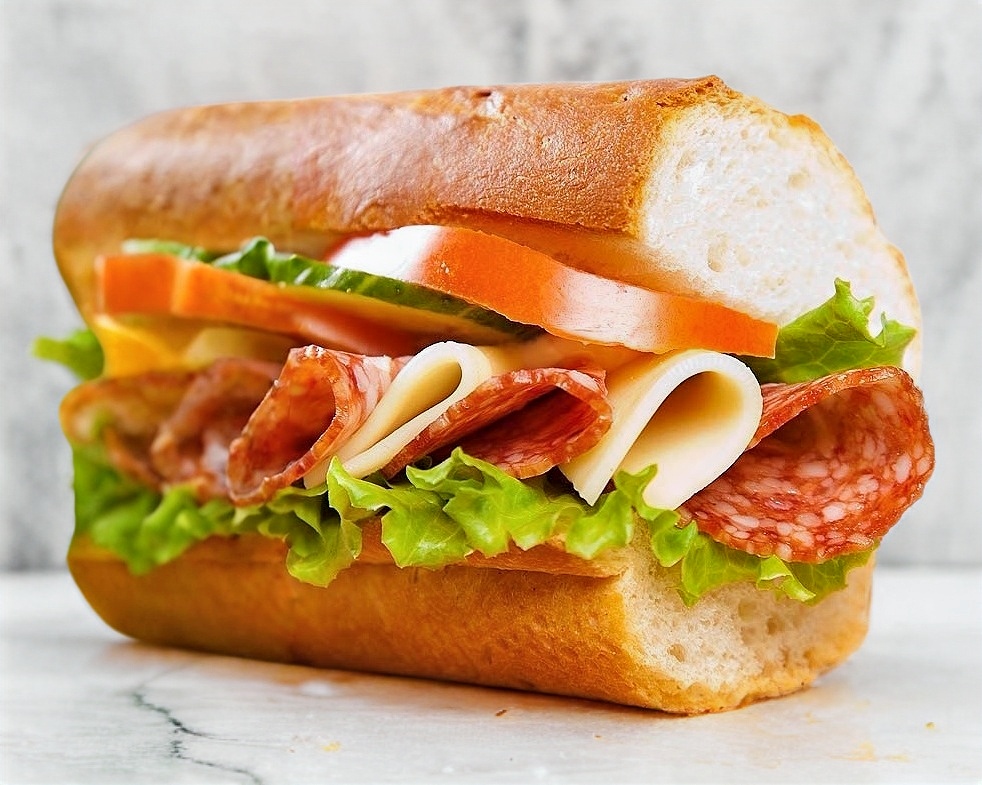 Pan baguett blanco natural, salsa de tomate, queso manchego, salami, pepperoni, lechuga, pepino, zanahoria.
