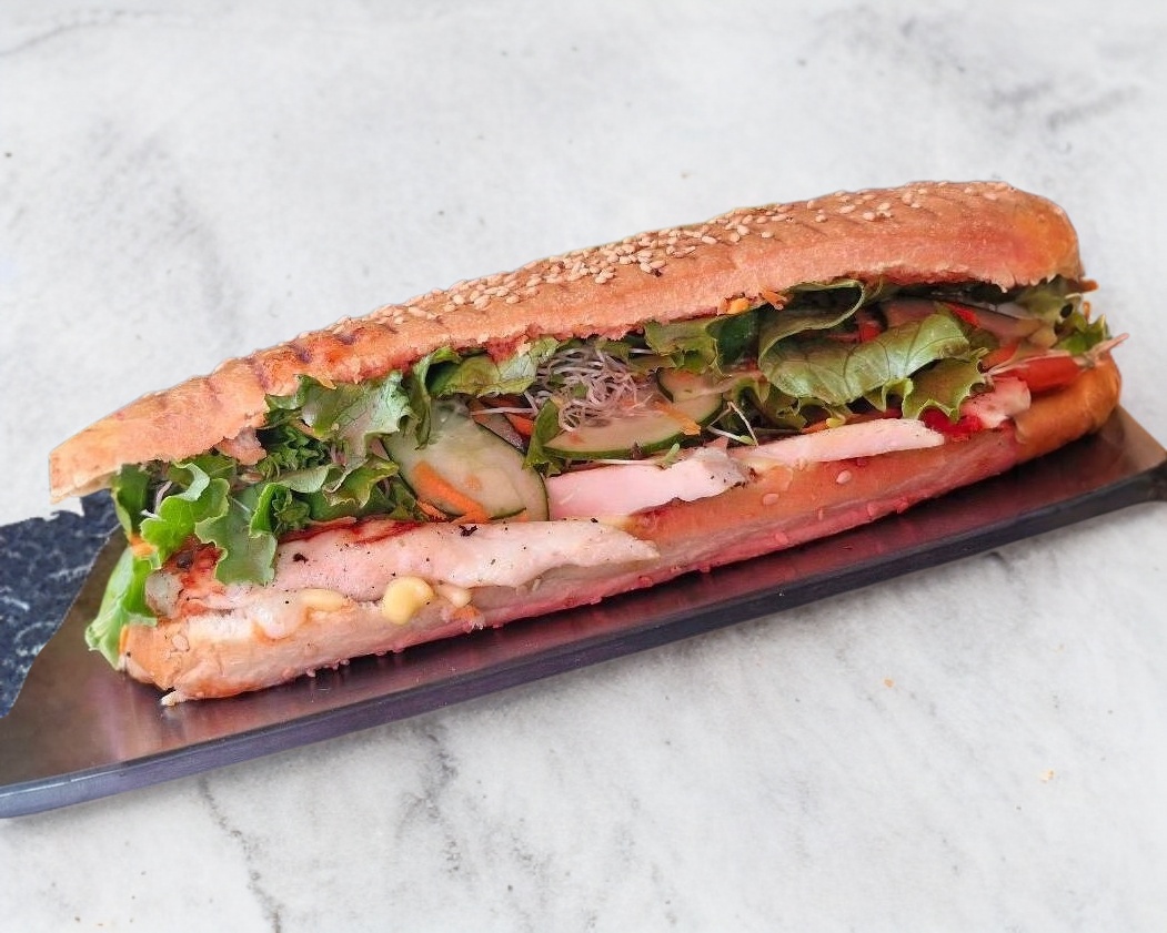 Pan blanco con topping de ajonjoli, salsa de tomate, mezcla de queso mozarella y manchego, pollo asado a la plancha, vegetales frescos (lechuga, zanahoria, pepino y germinado de alfalfa).