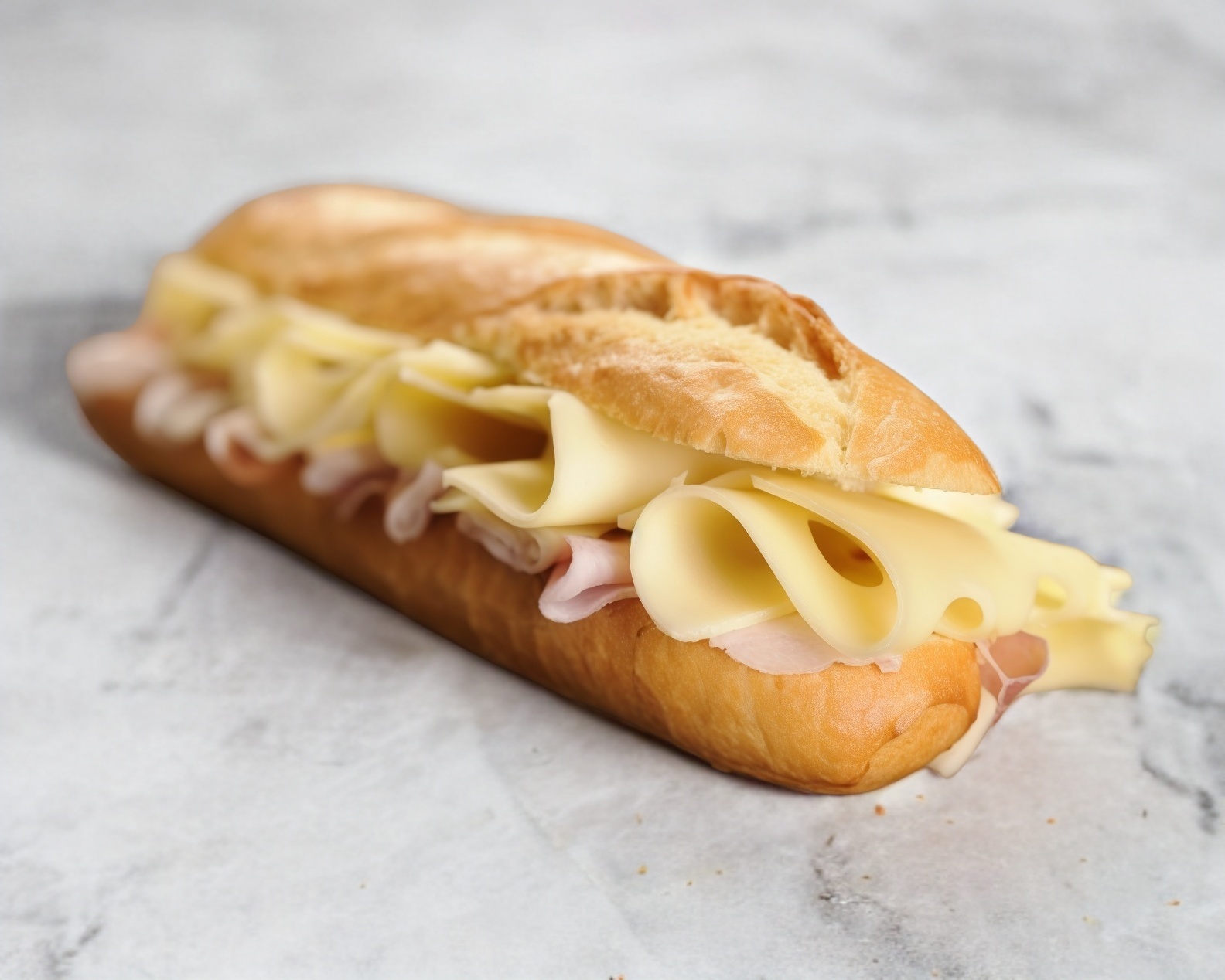 Pan baguett blanco natural, salsa de tomate, queso manchego, jamon ahumado selva negra, lechuga, pepino, zanahoria; aderezo a elegir.